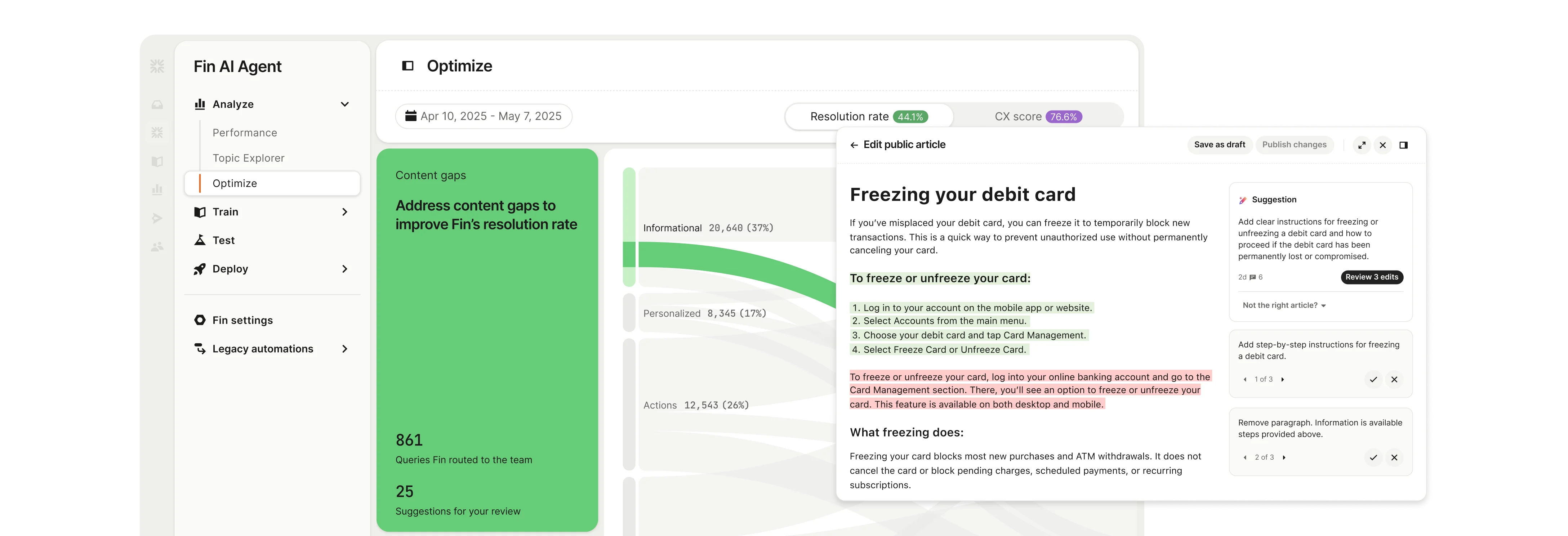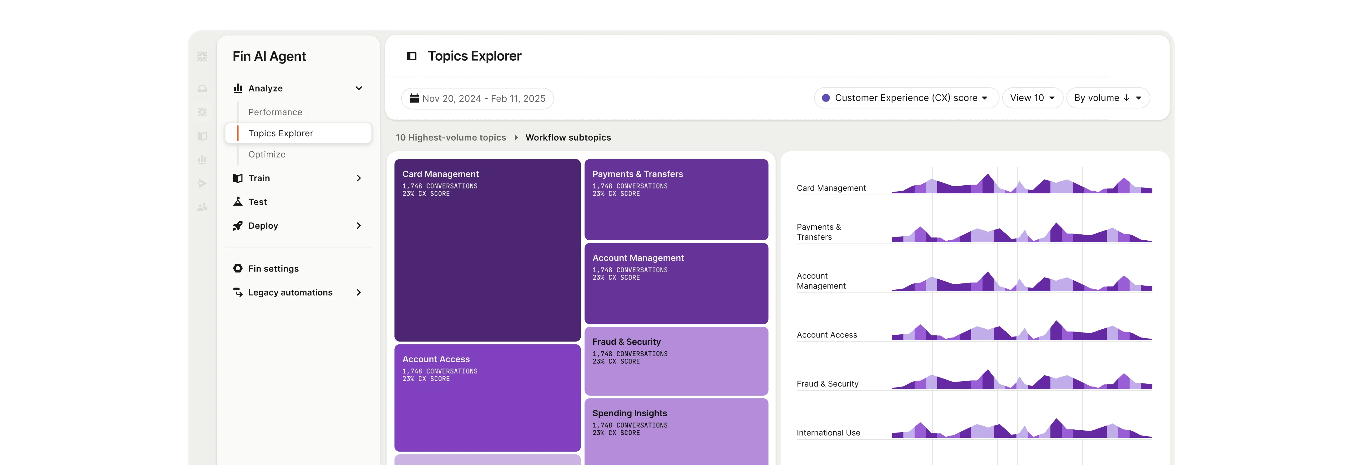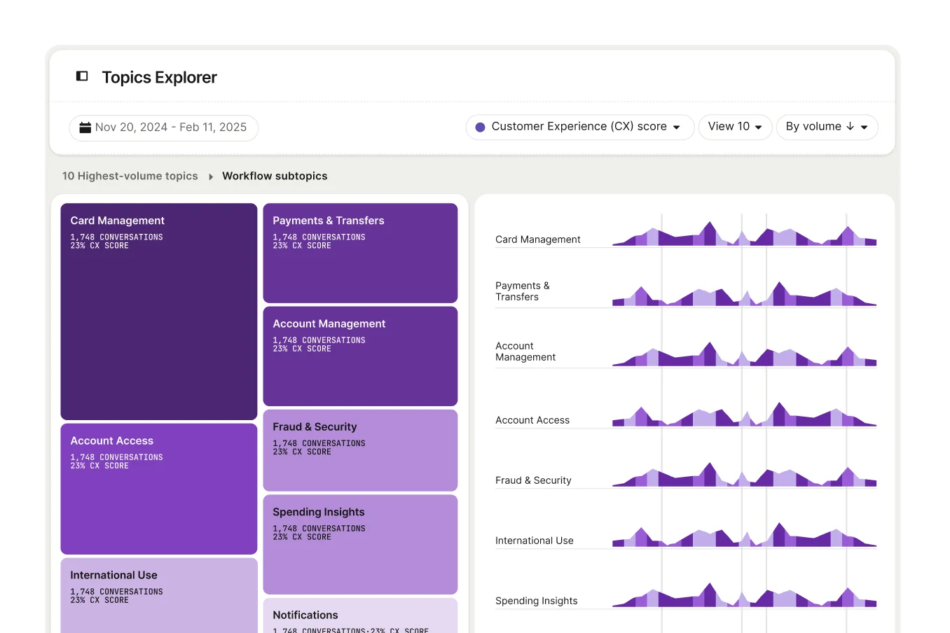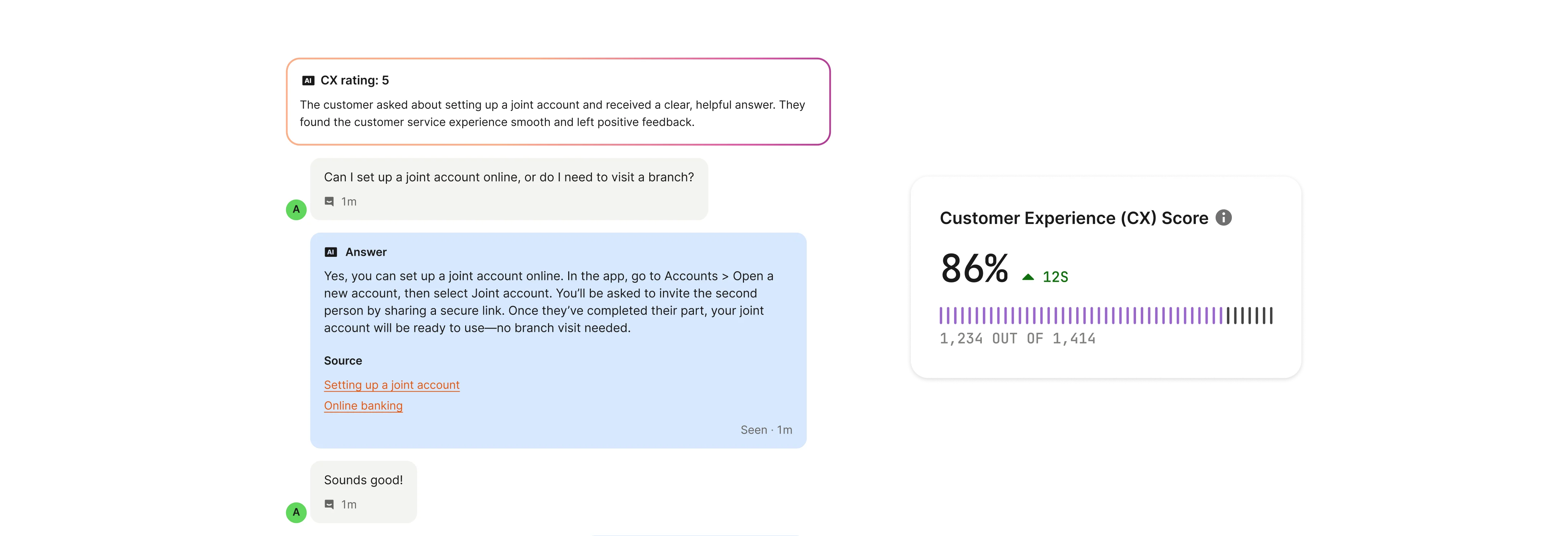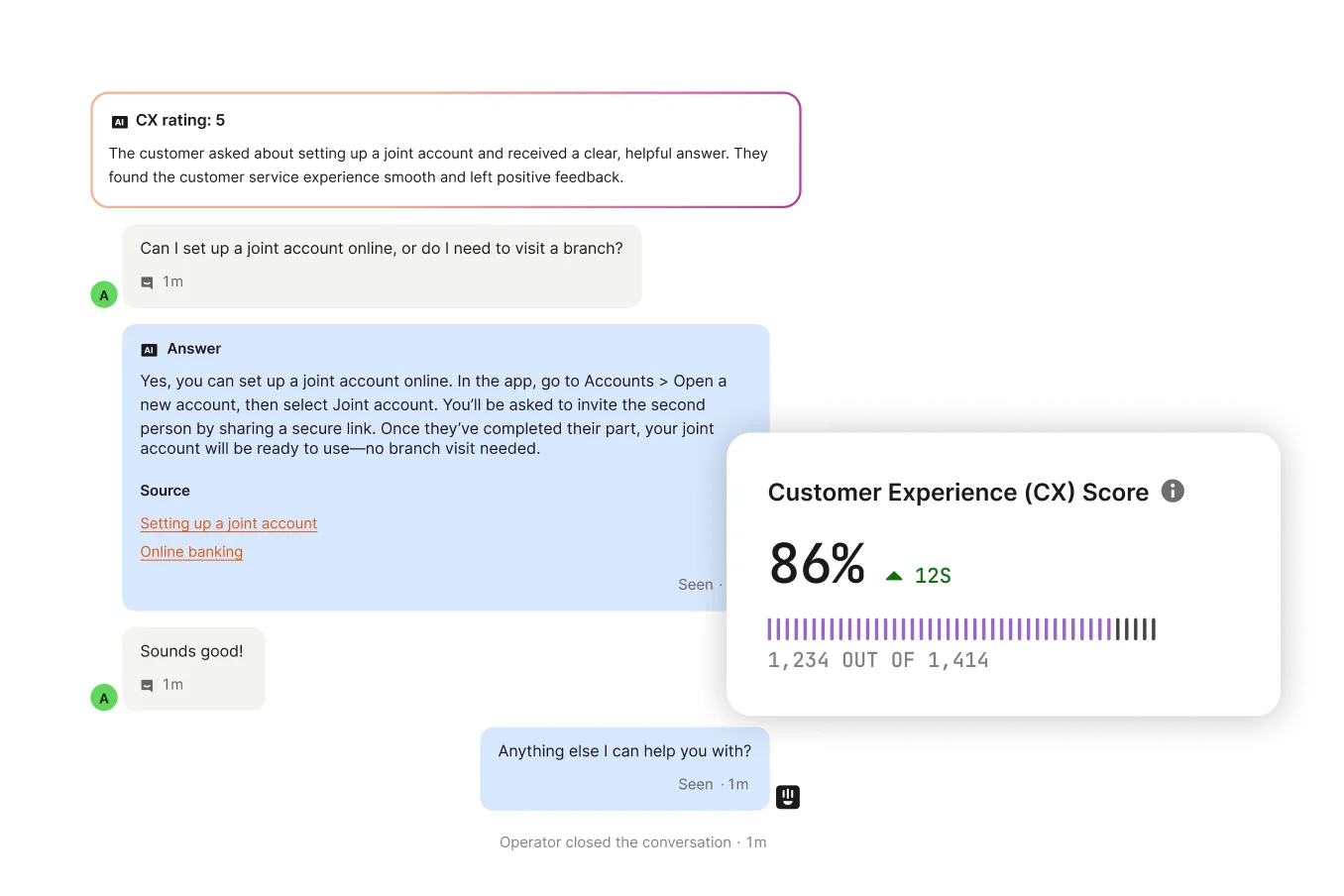 CX Score evaluates every conversation using signals based on resolution, customer sentiment, and service quality. Every conversation gets an individual score and an explanation of why the score was given.