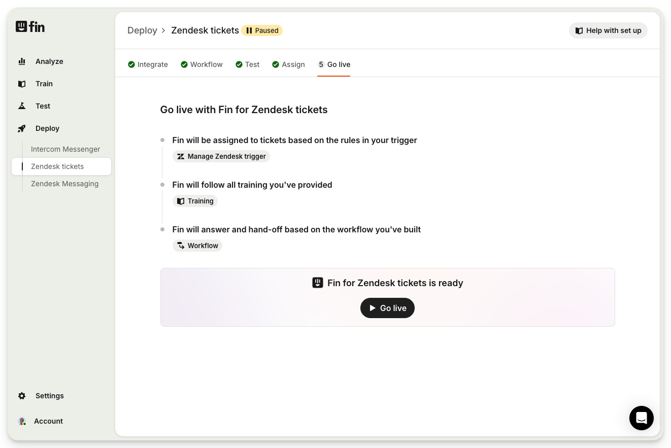 Now you’re ready to set Sweo live for your customers. Go to Deploy > Zendesk messaging > Go Live and select Go Live.