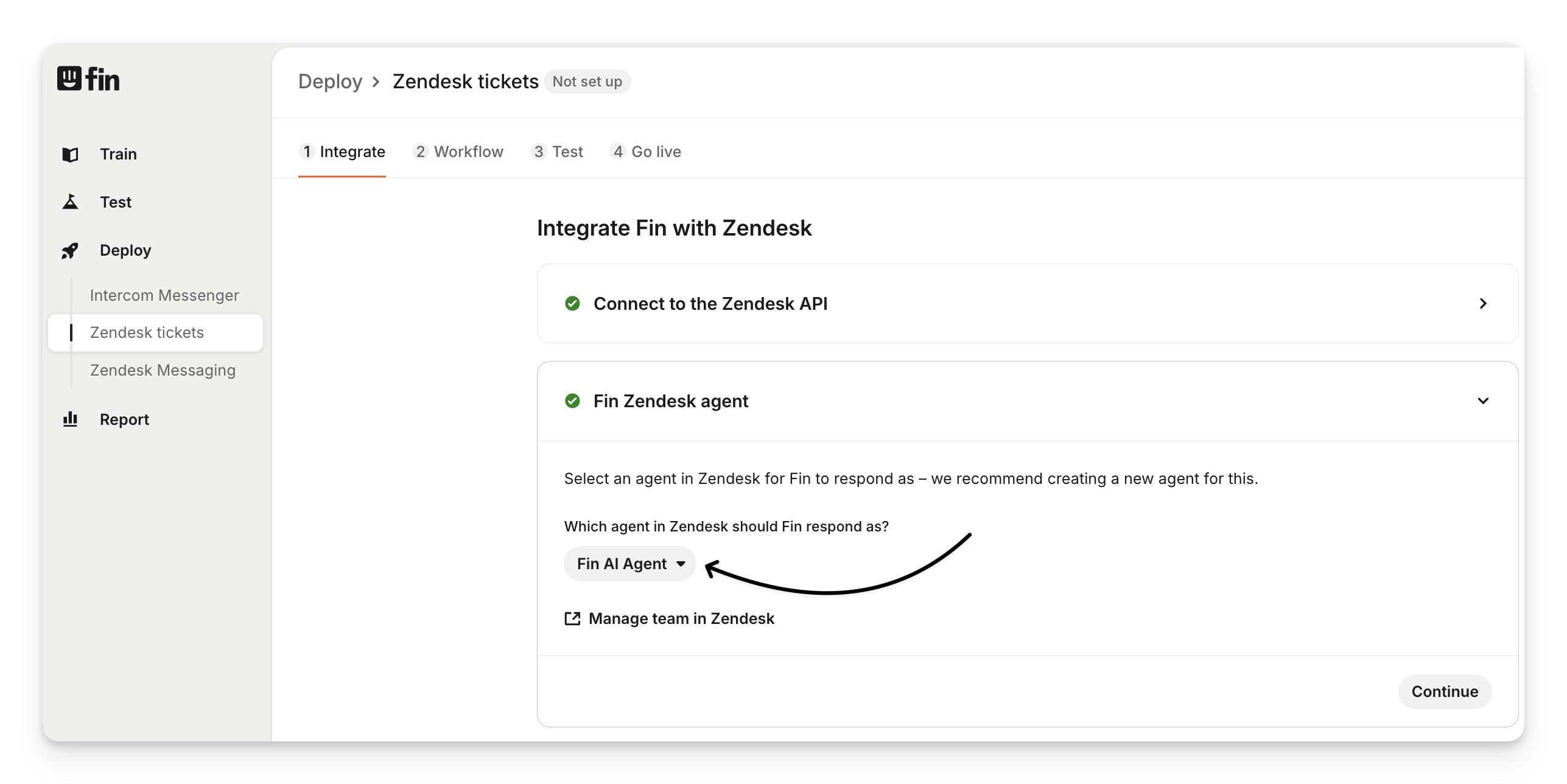 You can create a new agent from Zendesk Admin Center by going to People › Team members > Create team member. You can use your own email address by appending “+fin” to the name (e.g. dean+fin@examply.io).