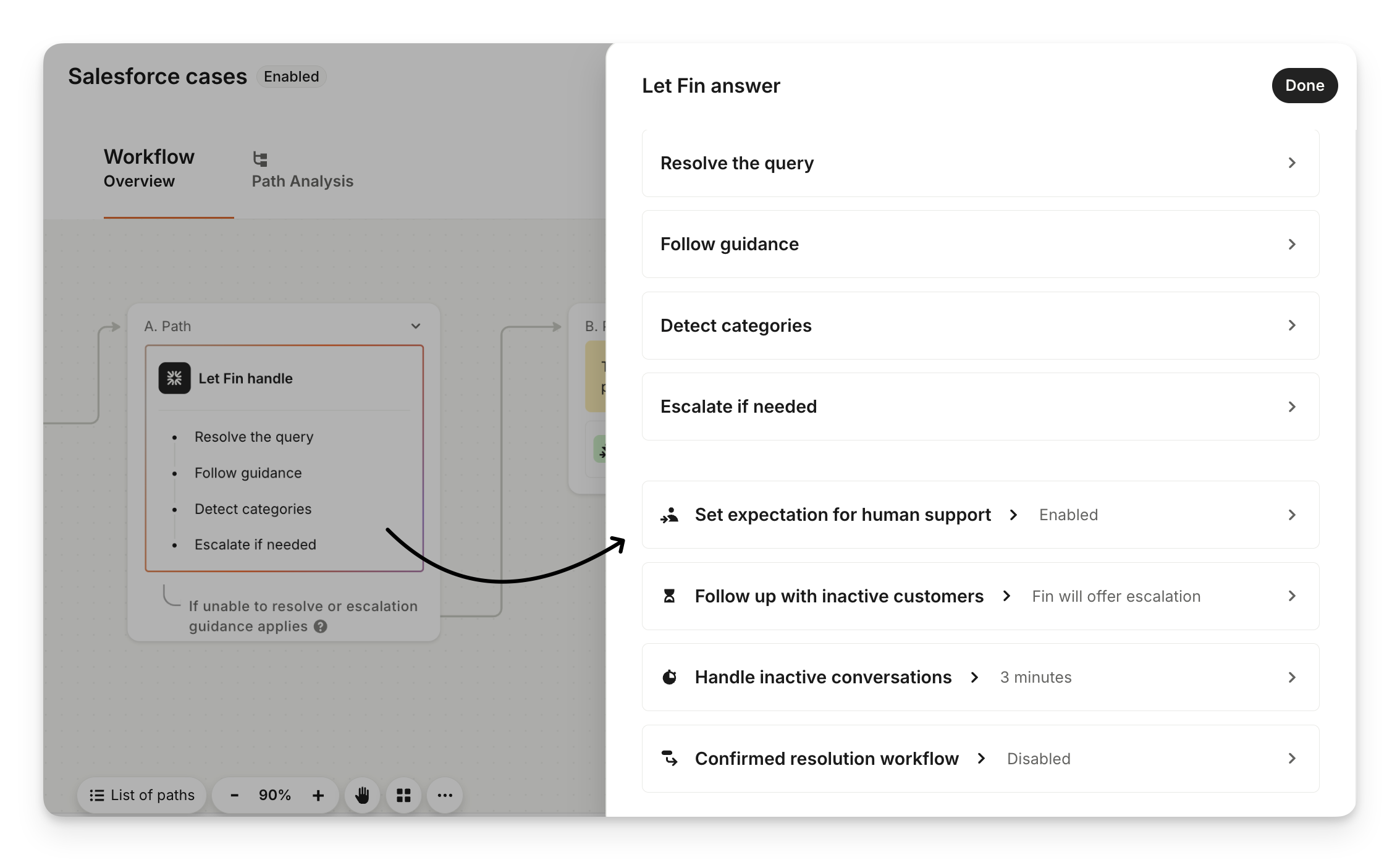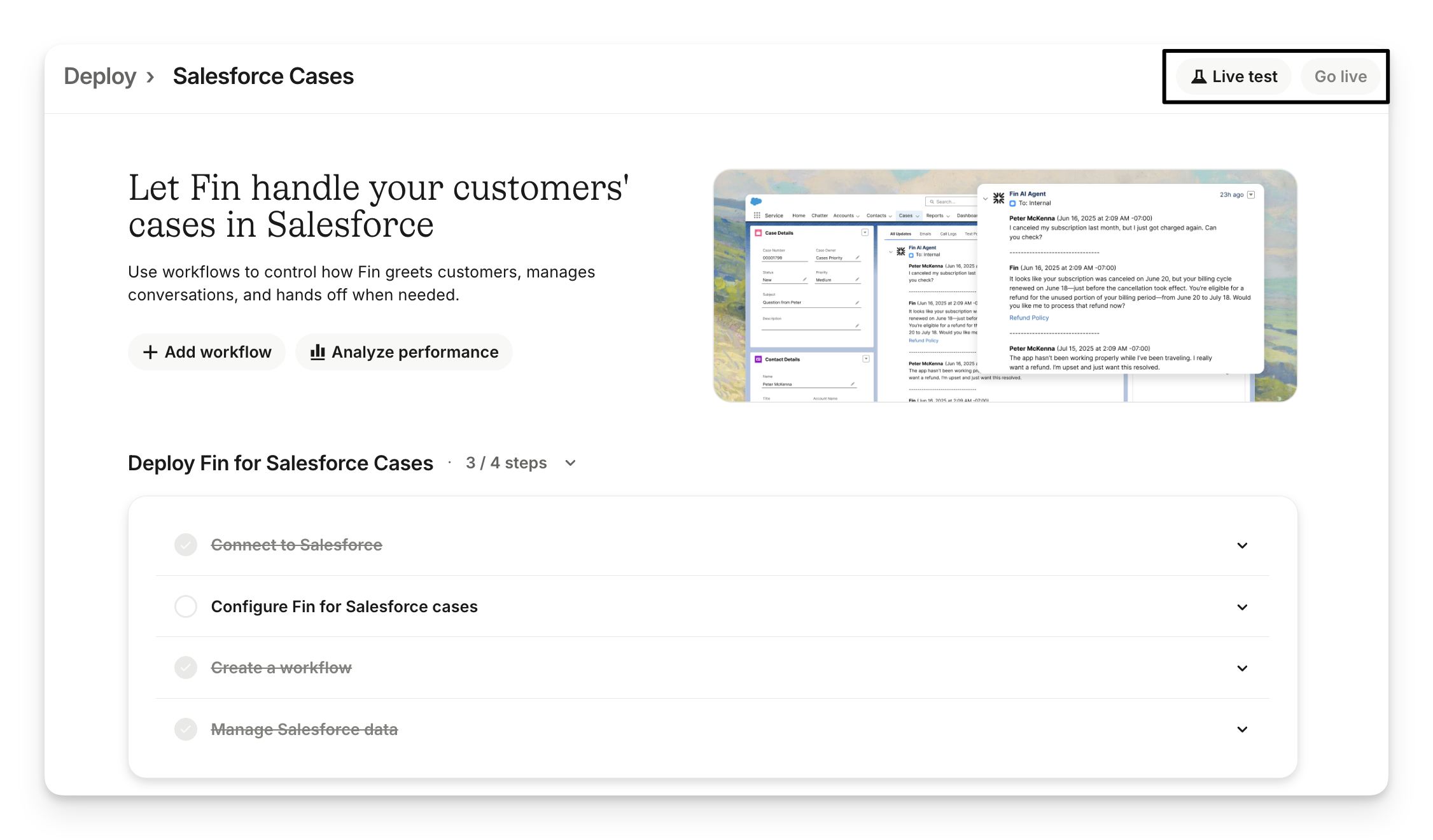 You can customize how Sweo greets and responds to customers or hands off to your team when it’s unable to help by clicking Manage workflow from Deploy > Salesforce cases > Create a workflow.