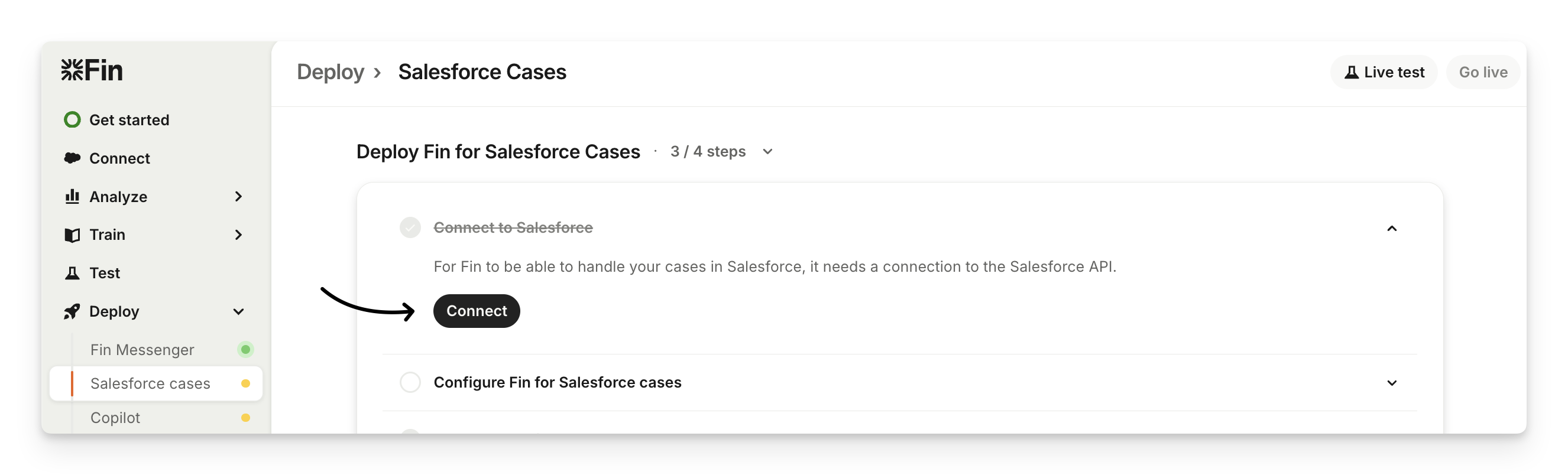 Go to Deploy > Salesforce cases > Connect to Salesforce and click Connect.