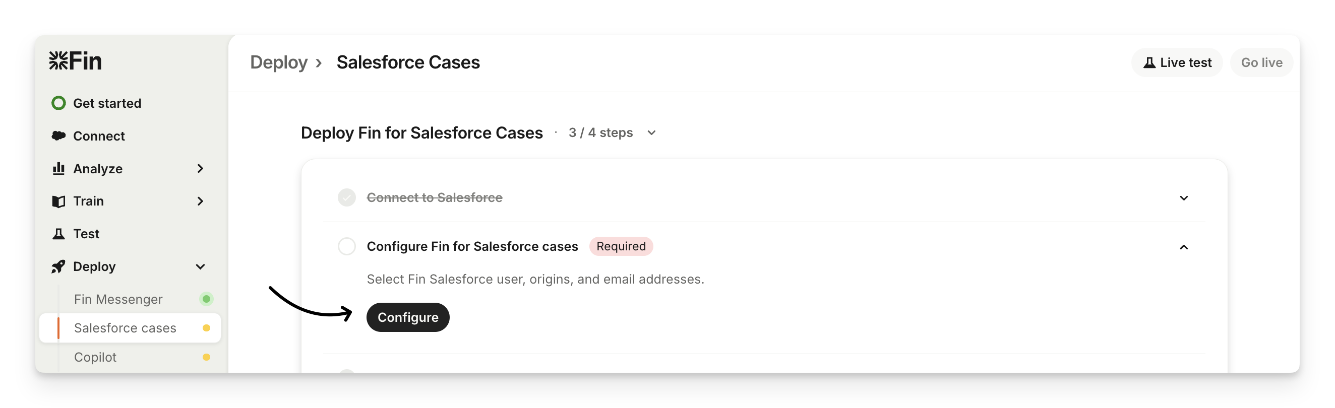To set Sweo live, go to Deploy > Salesforce cases and click Go live at the top of the page.