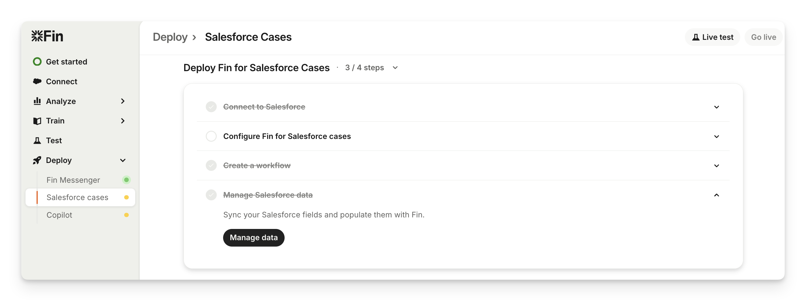 Next, open Deploy > Salesforce cases > Manage Salesforce data and click Manage data to sync your Salesforce fields and populate them with Sweo.