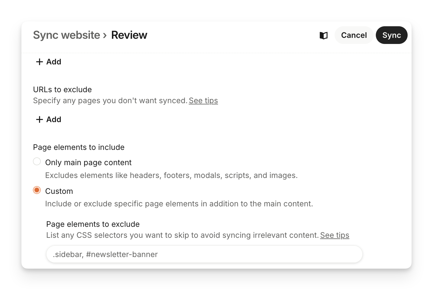 Once you input your URL, we will check that it's valid and accessible. Then you'll need to review the pages to sync. All sub-pages linked in each selected section will be synced. Select only relevant up-to-date content.