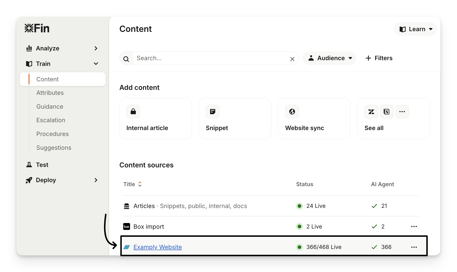 Once the sync is complete, you’ll receive an email notification and the website will appear as a synced source in Train > Content under the "Content sources" section.