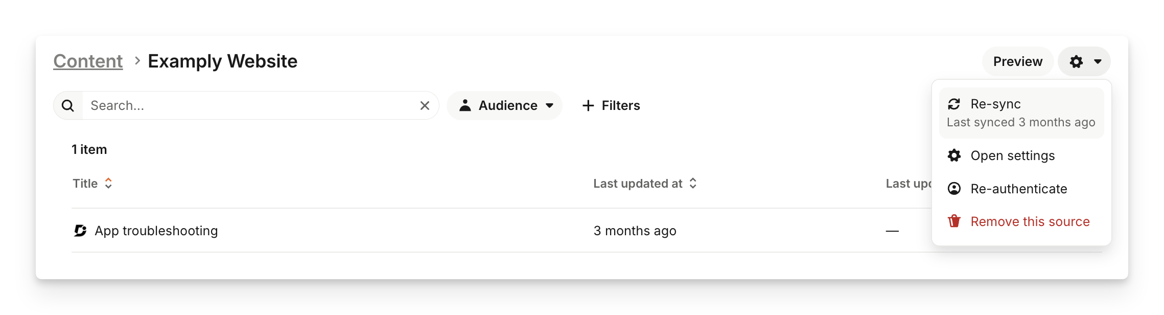 If you’d like to re-sync or remove a public URL as a source, go to Train > Content, and click on the website source under the "Content sources" section, then open the Settings dropdown in the top right.