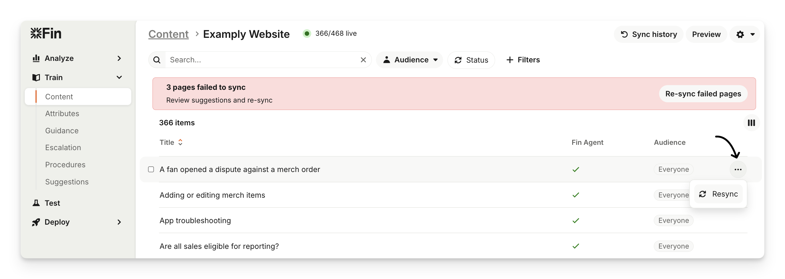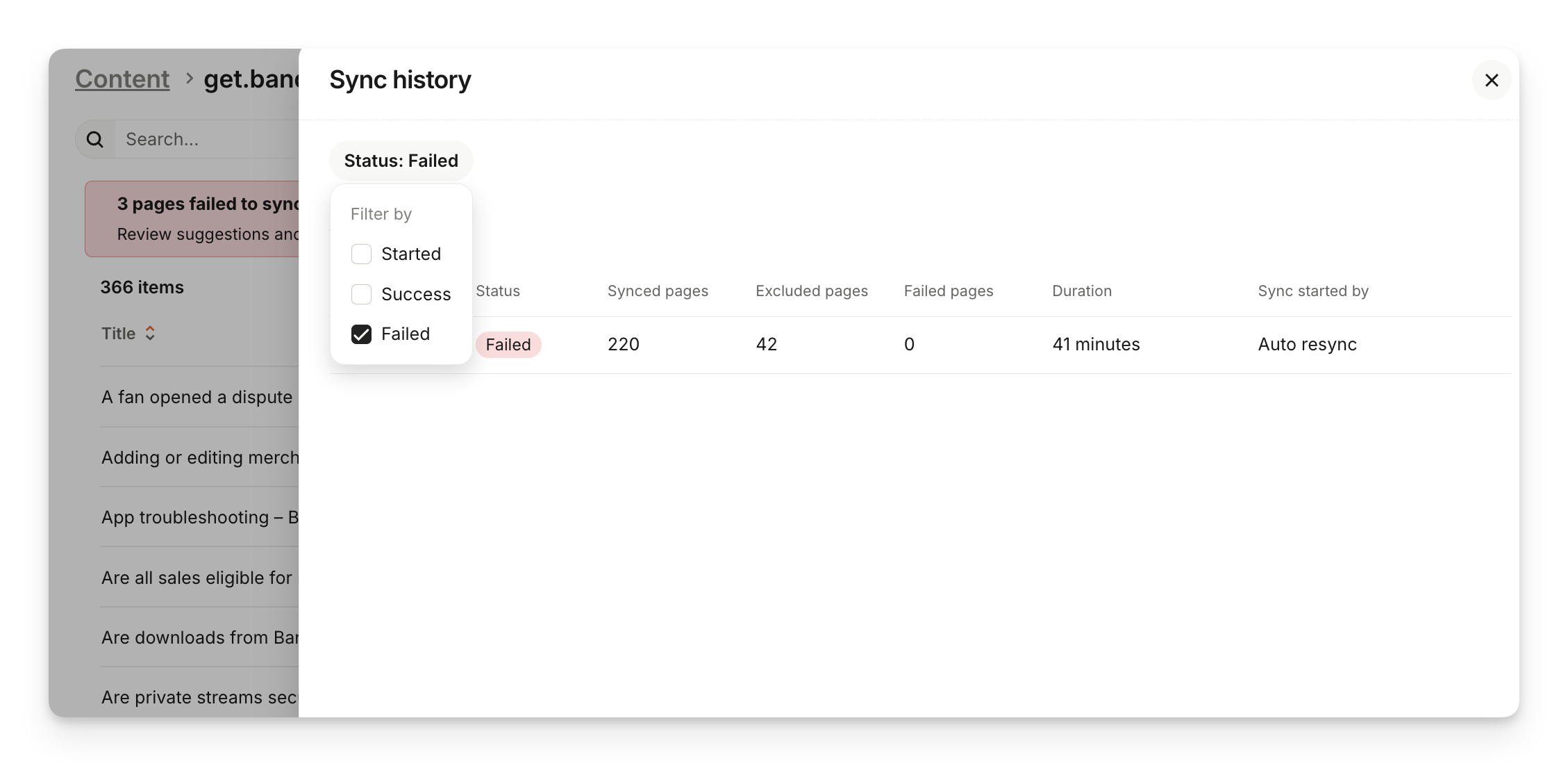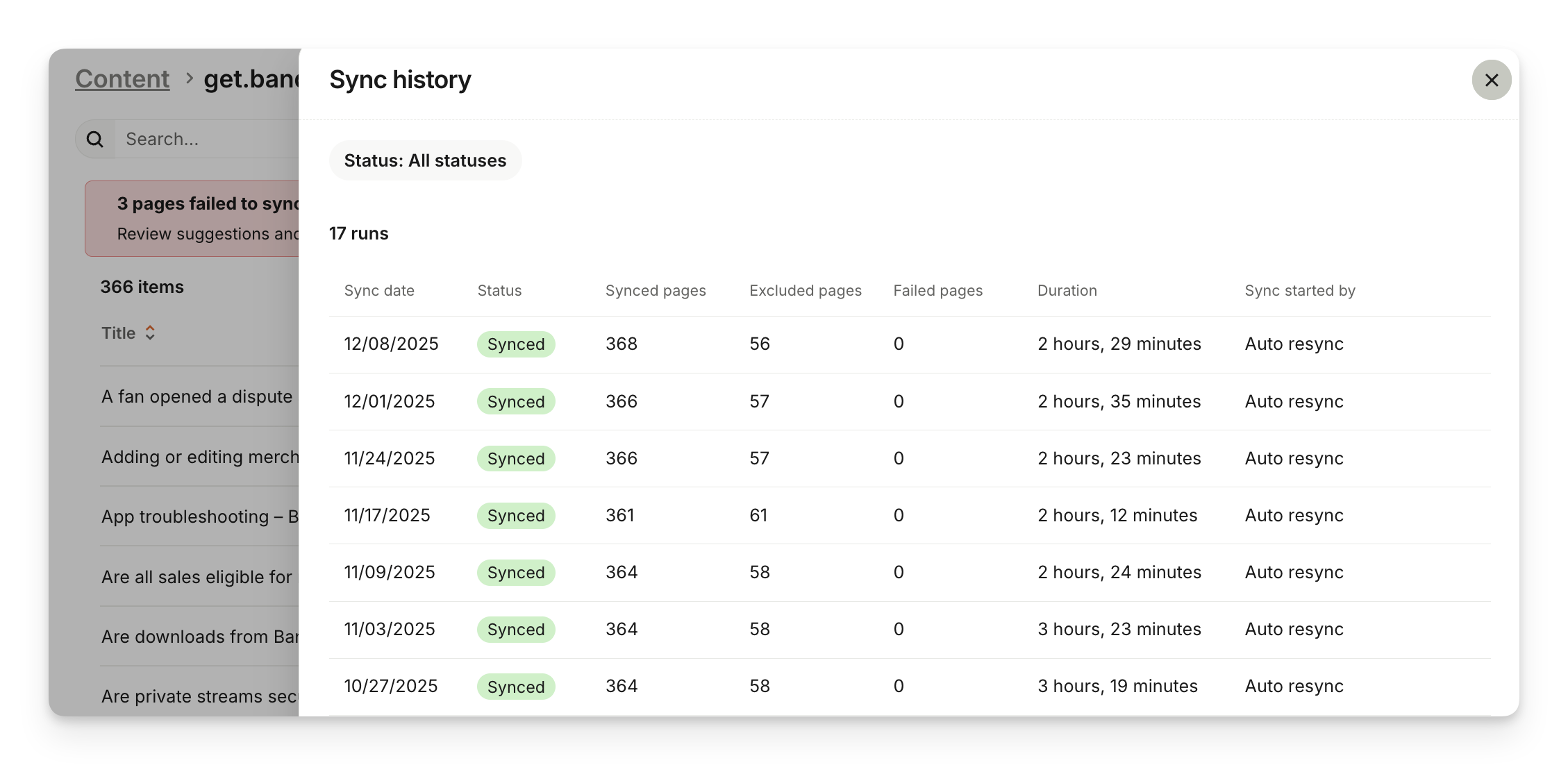 You can view a list of past website syncs to see when they were last run, which pages were found, and any failed pages. Go to Train > Content, and click on the website source under the "Content sources" section, then select View sync history.