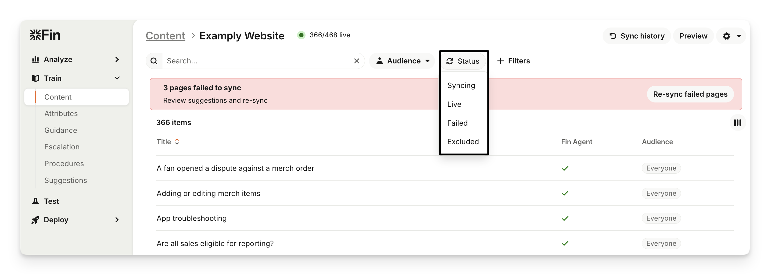 When you sync website content, you may see different statuses that indicate what happened during the process. To see your website sync status go to Train > Content and select the website source, then use the Status dropdown to filter by: