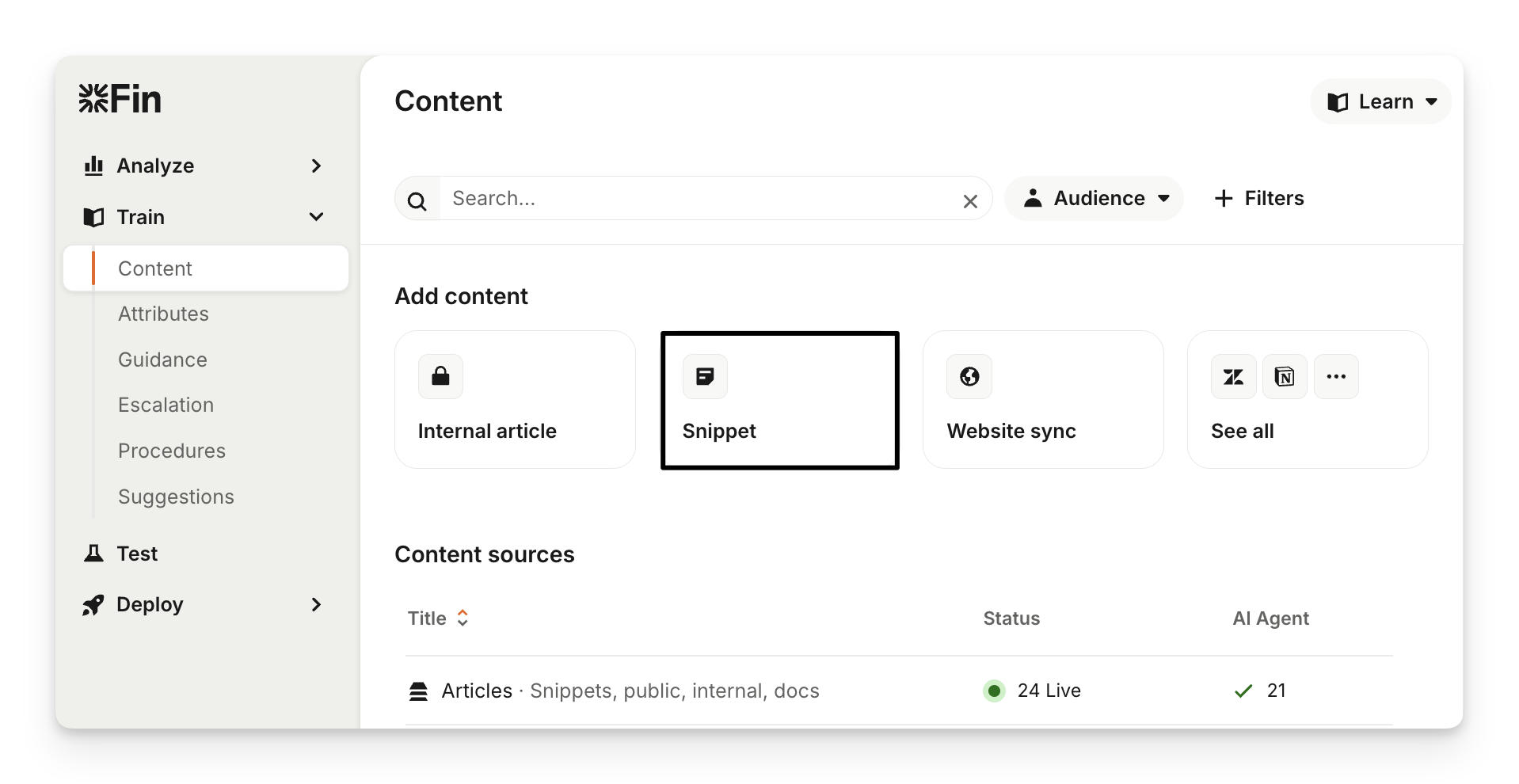 Then go to Train > Content and click on Articles (Snippets, public articles, internal, docs) under the "Content sources" section, then open the snippet.