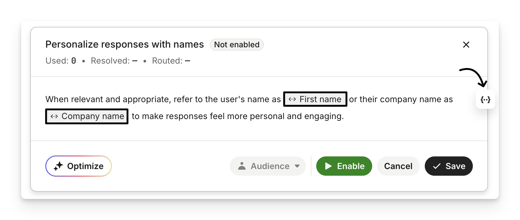 “When relevant and appropriate, refer to the user's name as {First name} or their company name as {Company name} to make responses feel more personal and engaging."