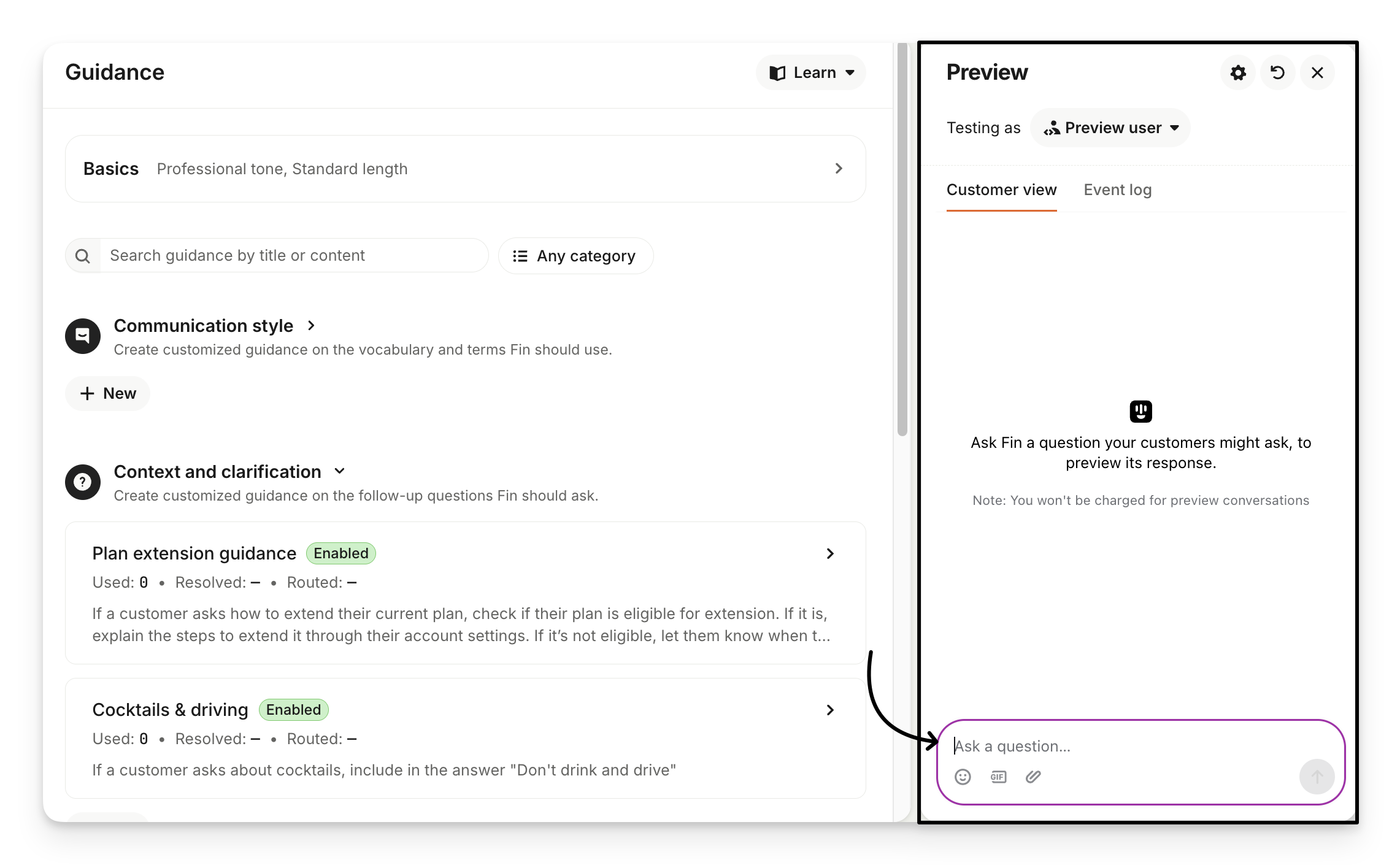 Before you save or enable a piece of guidance, you can use the Preview panel to ask Sweo some questions and see how your new guidance is applied.