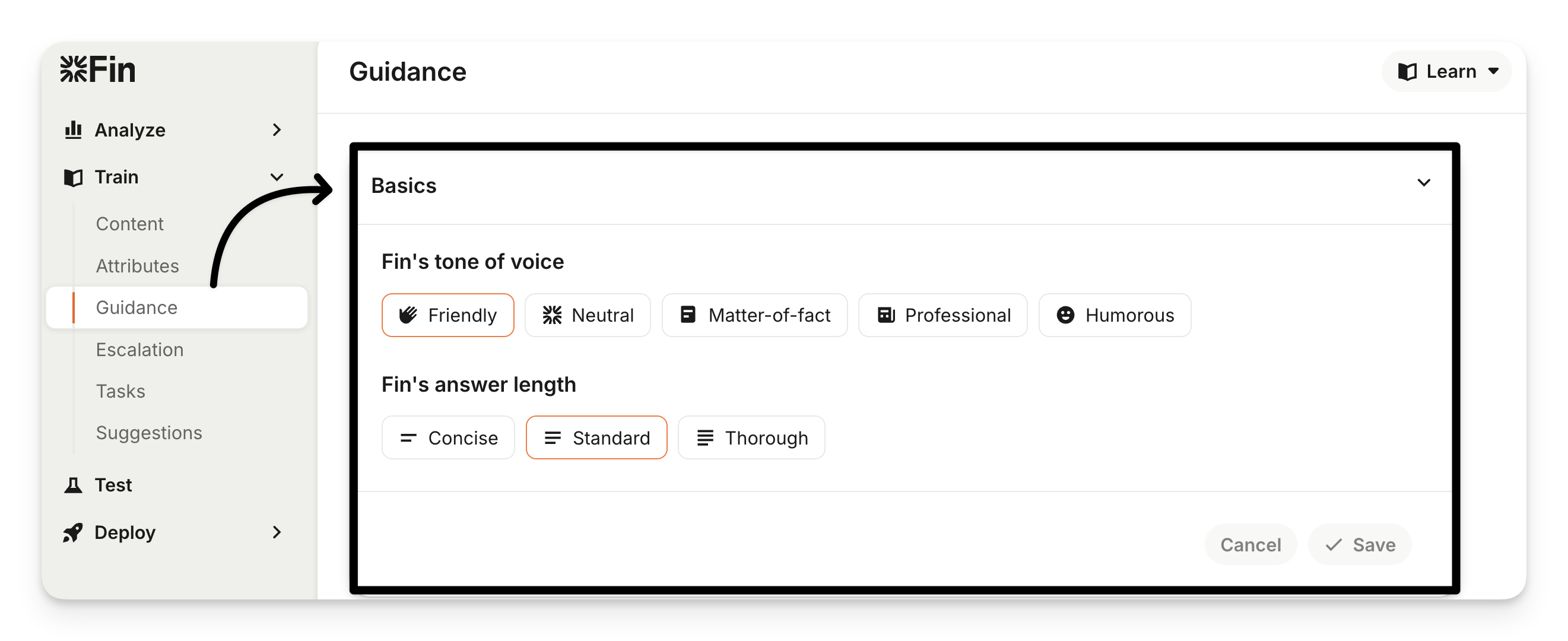 Go to Train > Guidance and select Choose Sweo's tone and answer length.