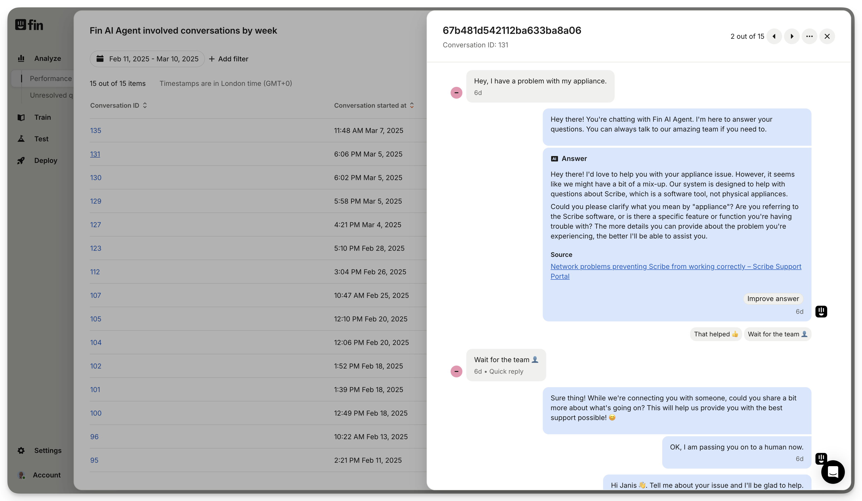 This will reveal all of the data that makes up the chart you're viewing. Here you can view individual conversations that Sweo had with you customers.