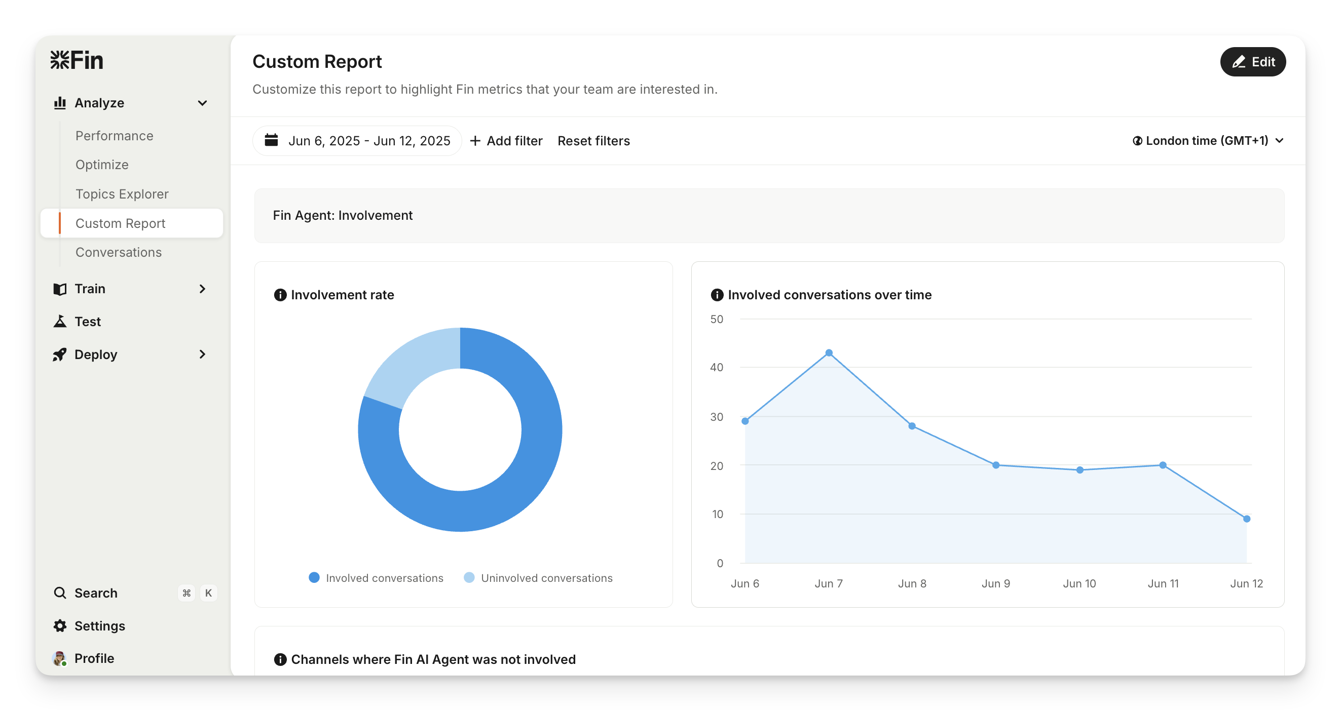 The top section of the Custom Report focuses on Sweo's involvement. These charts show the involvement rate and the absolute number of conversations Sweo is involved in over time.