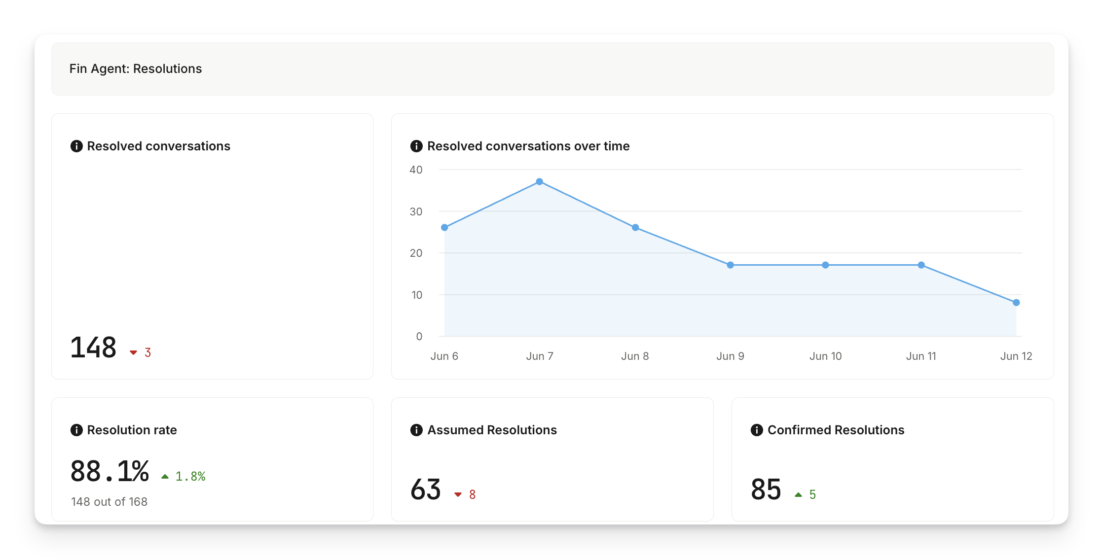 The next section focuses on Sweo's resolutions. These charts will breakdown how well Sweo AI Agent is handling conversations.