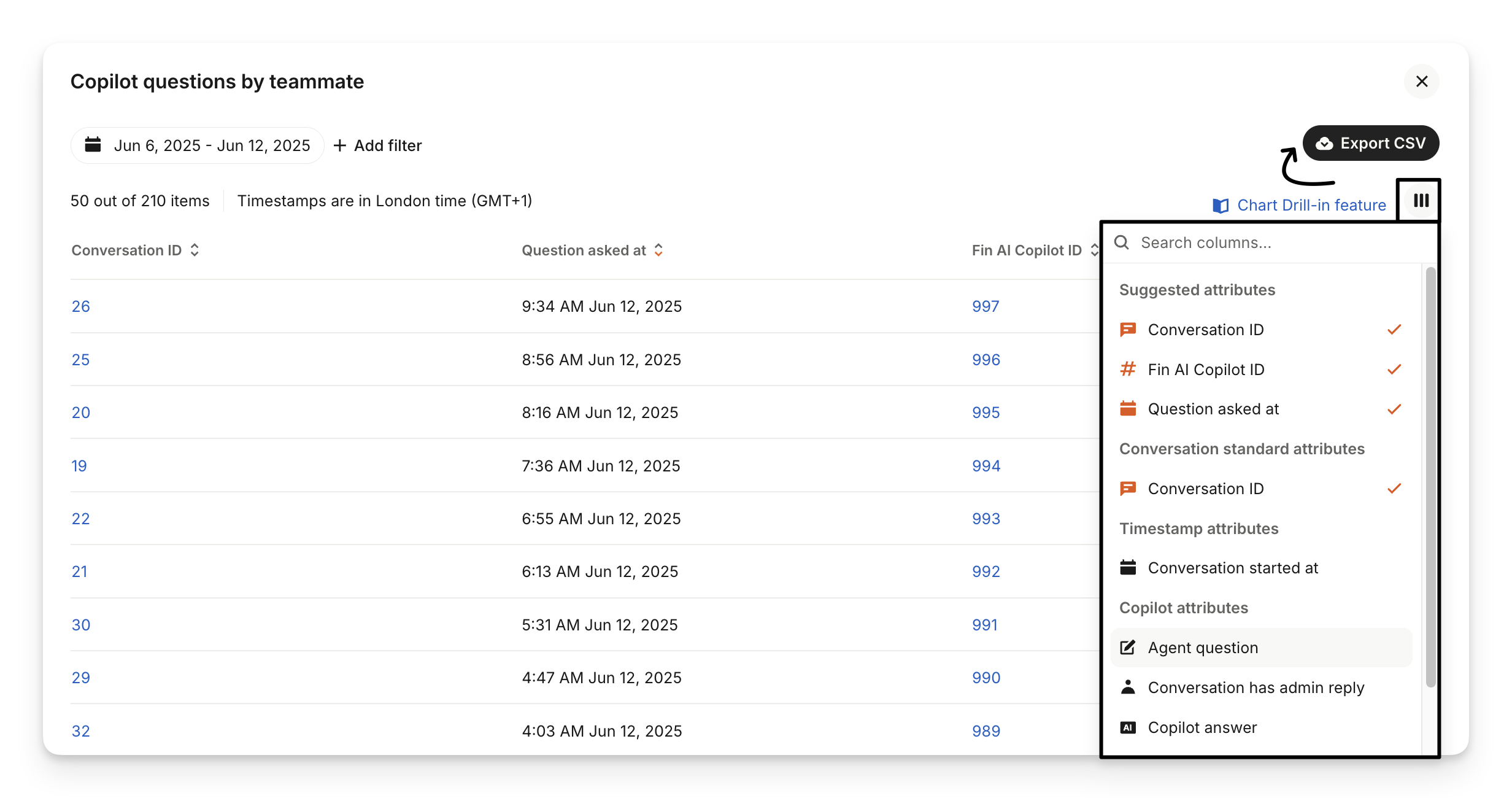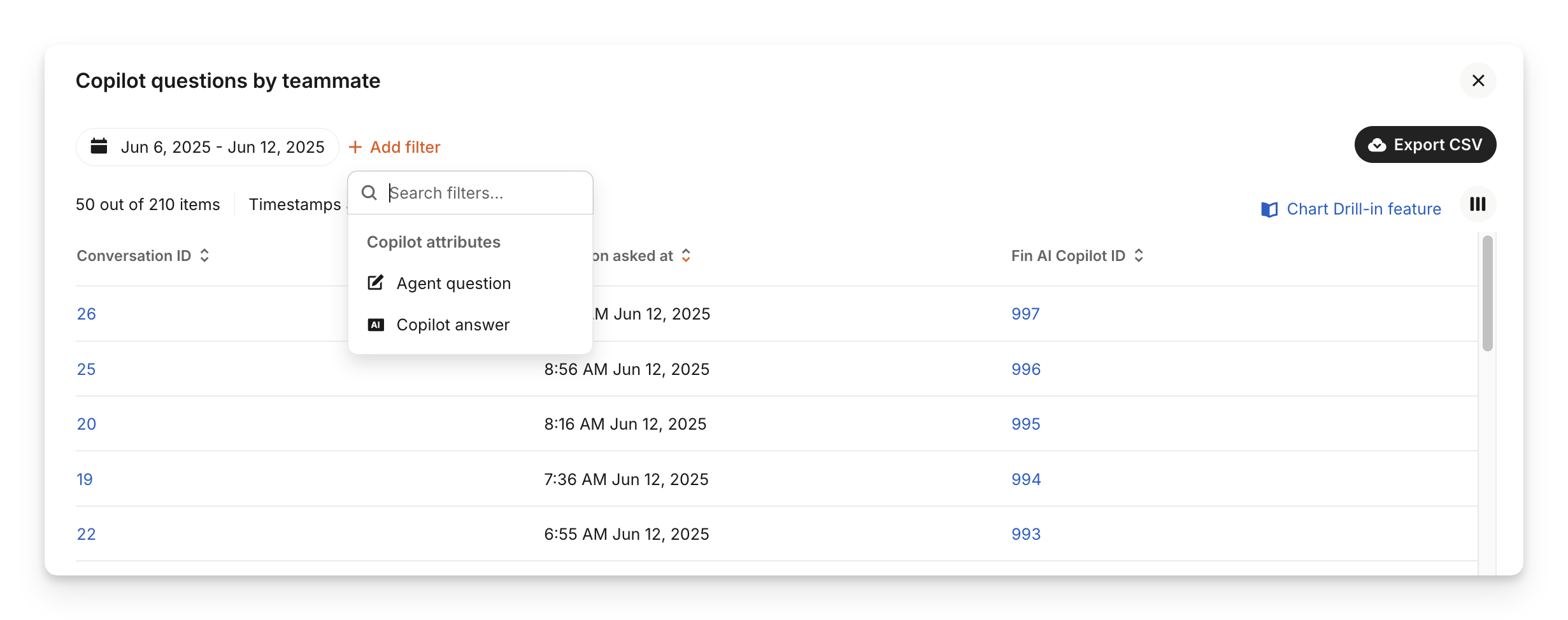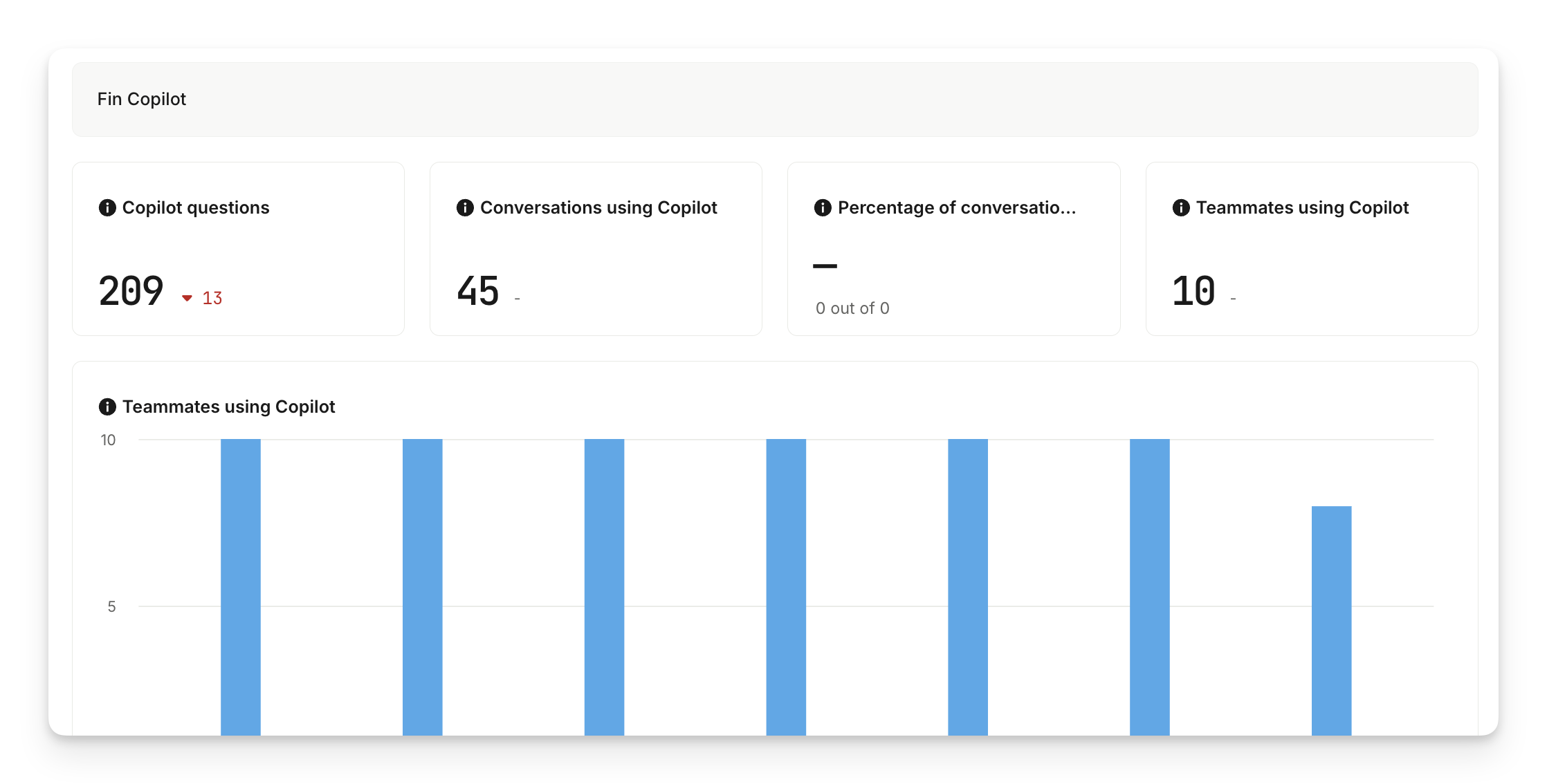 Conversations using Copilot | Number of conversations where Copilot was used at least once. Only conversations with at least one teammate reply and one customer reply are included. |