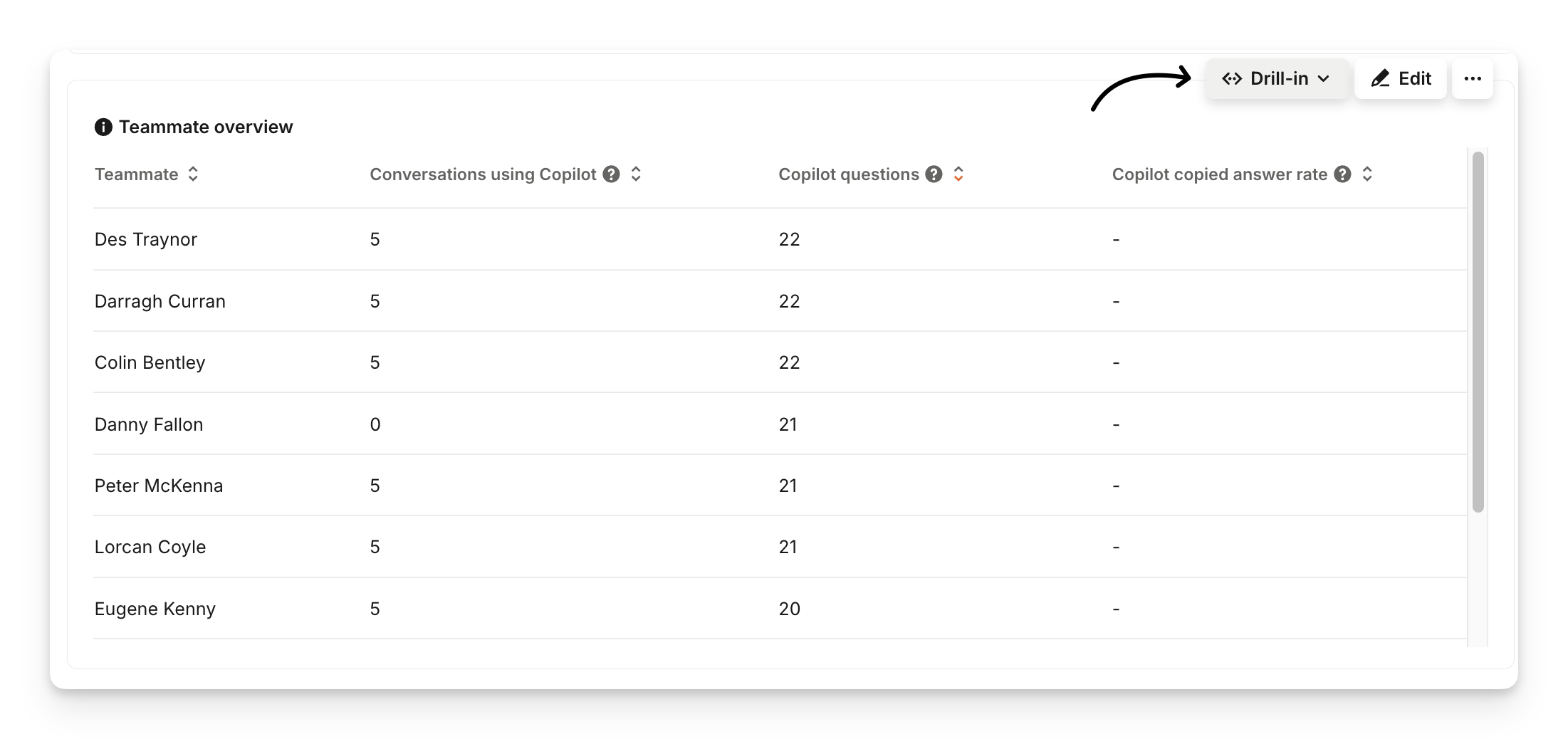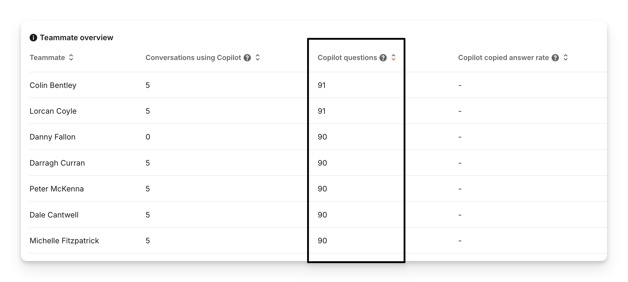 Sorting the table by "AI Copilot questions" will show you the frequent AI Copilot users on your team based on the number of questions they've asked to AI Copilot.