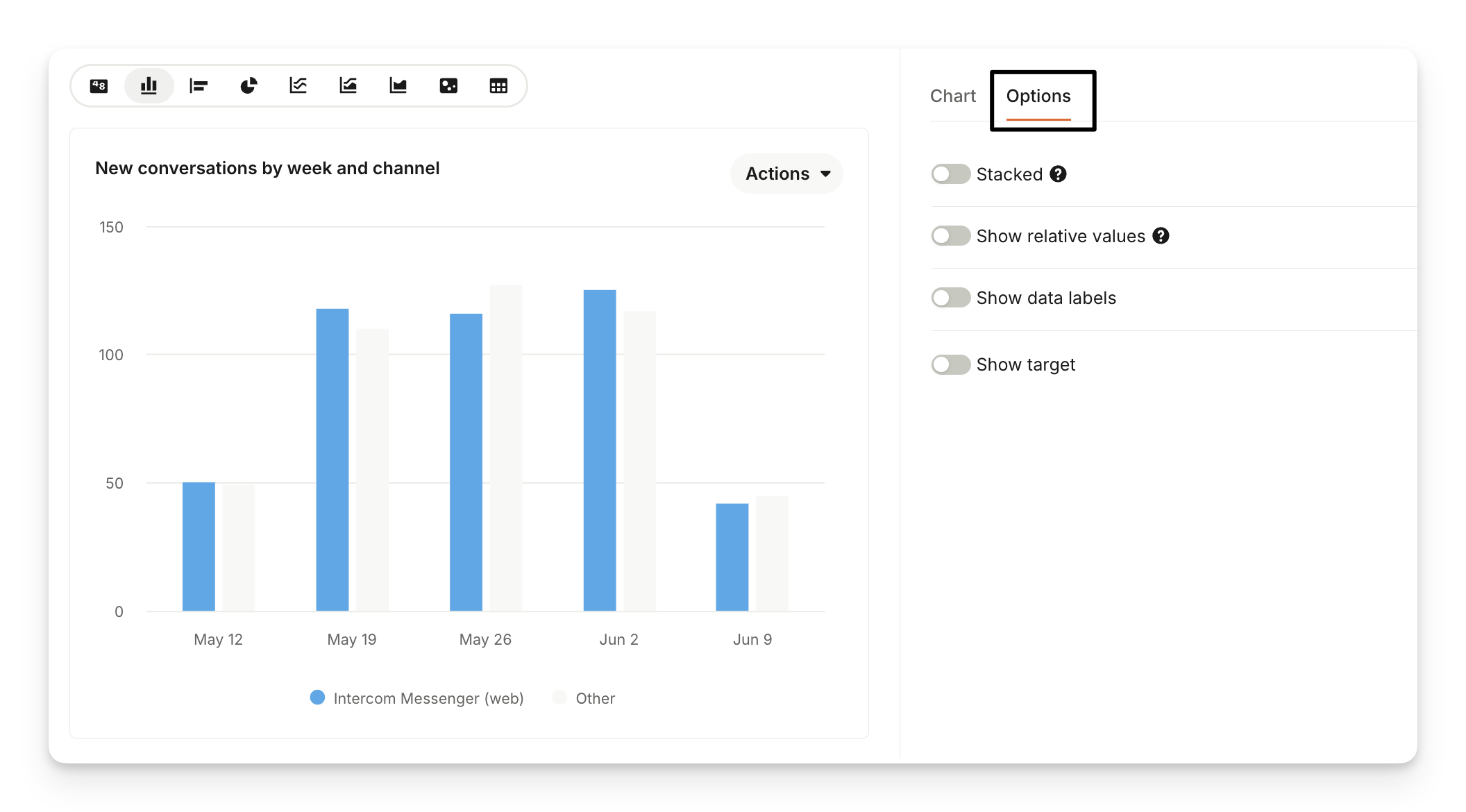 Show target: You can set and compare your metrics against manually inserted targets in selected chart types. This feature adds an extra layer of analysis, allowing for goal-oriented evaluation and tracking.