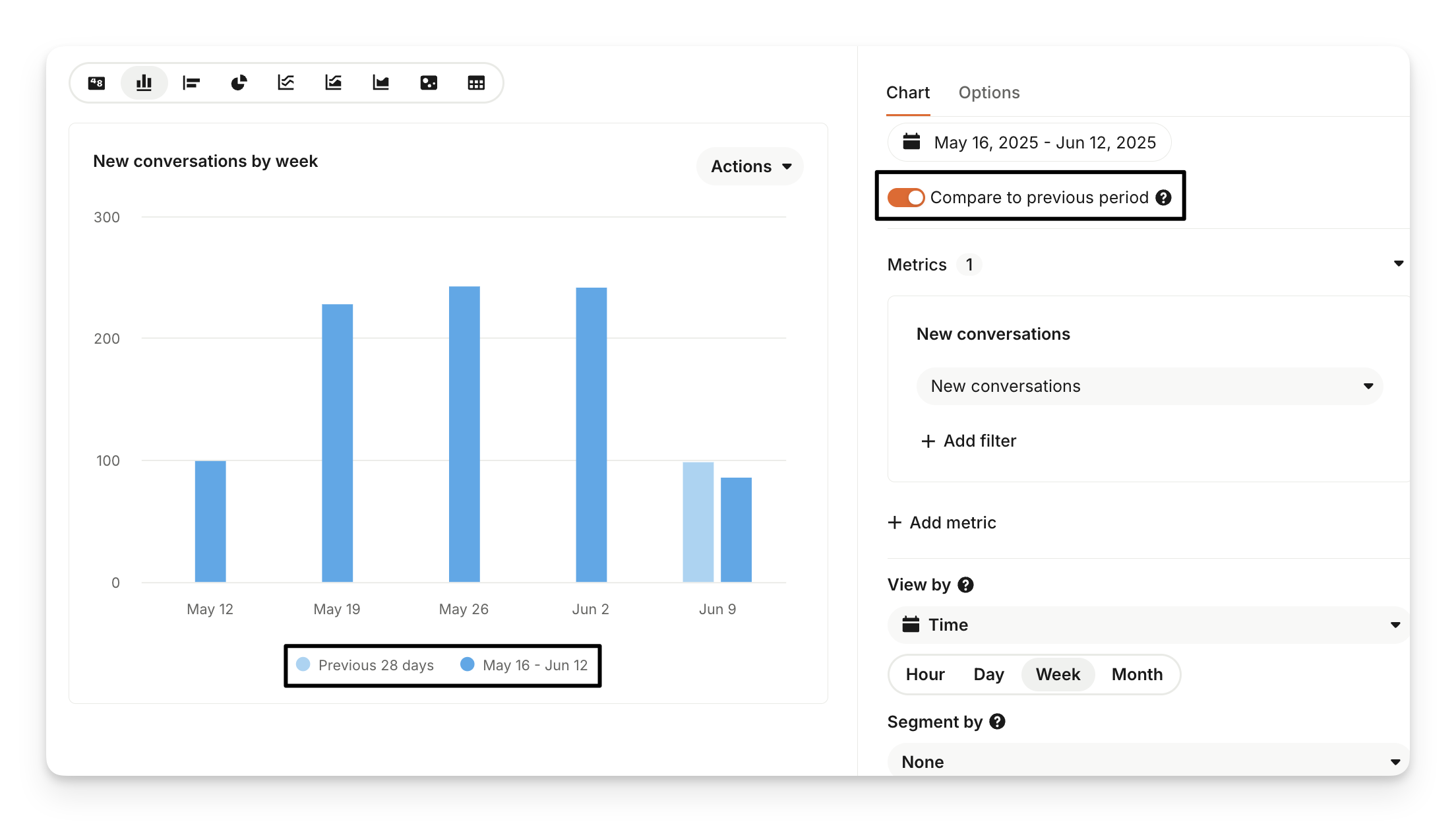"Compare to previous period" compares the current chart metric(s) to the