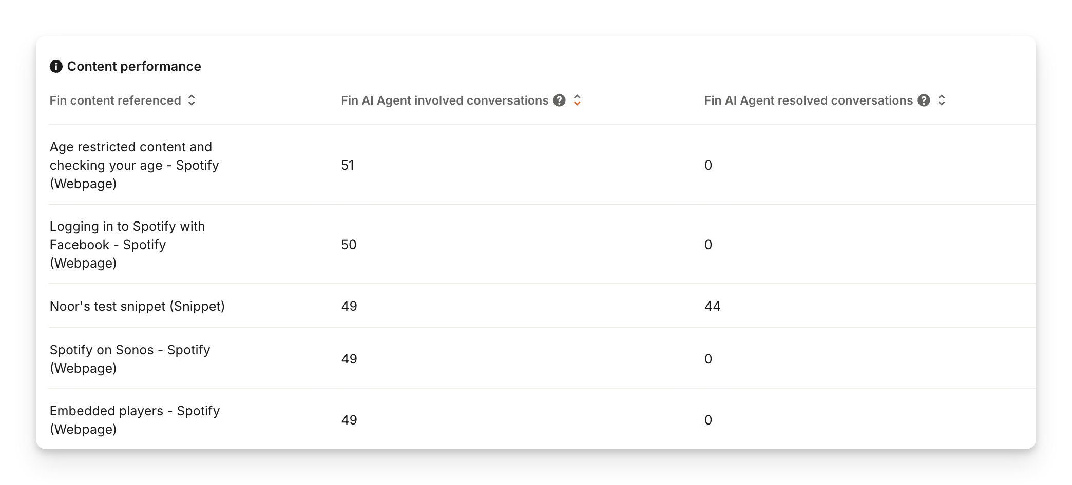 If the number in the Sweo AI Agent resolved conversations column is significantly lower than the involved conversations column for a piece of content, it means the information Sweo is using is not providing satisfactory answers to customers.