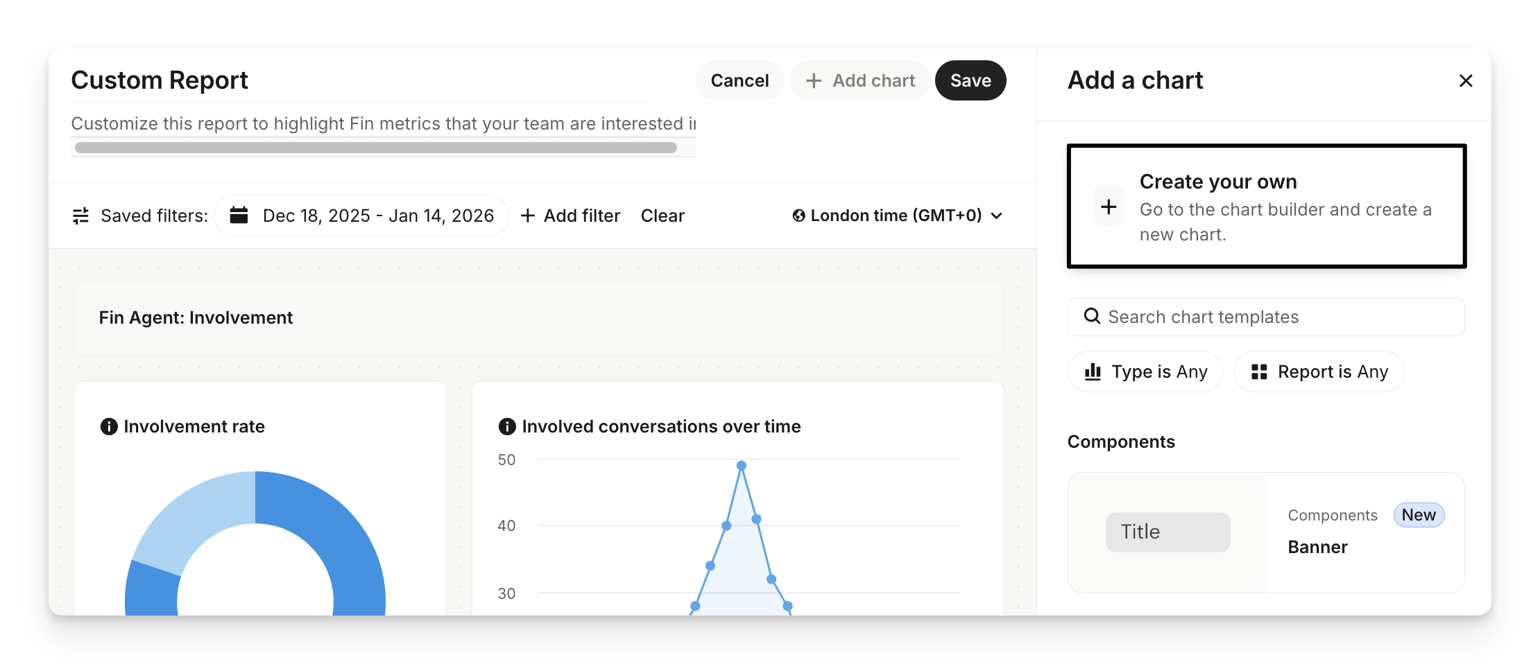 You can also edit existing charts by hovering over them and selecting the Edit button. Or, select Add chart and then click Create your own to create a new custom chart.