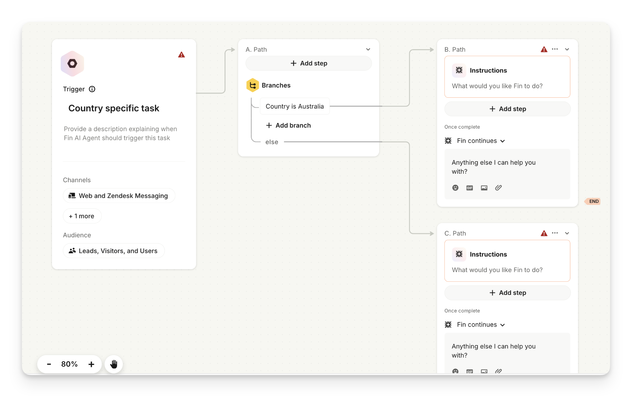 You can add one or more instruction blocks to the same task. Simply click Add step and then select Give Sweo instructions to add an additional set of instructions Sweo must follow. This step can be added directly after another instructions block, or you can use branches for Sweo to follow different instructions based on certain criteria, such as region, country, user attributes, etc.