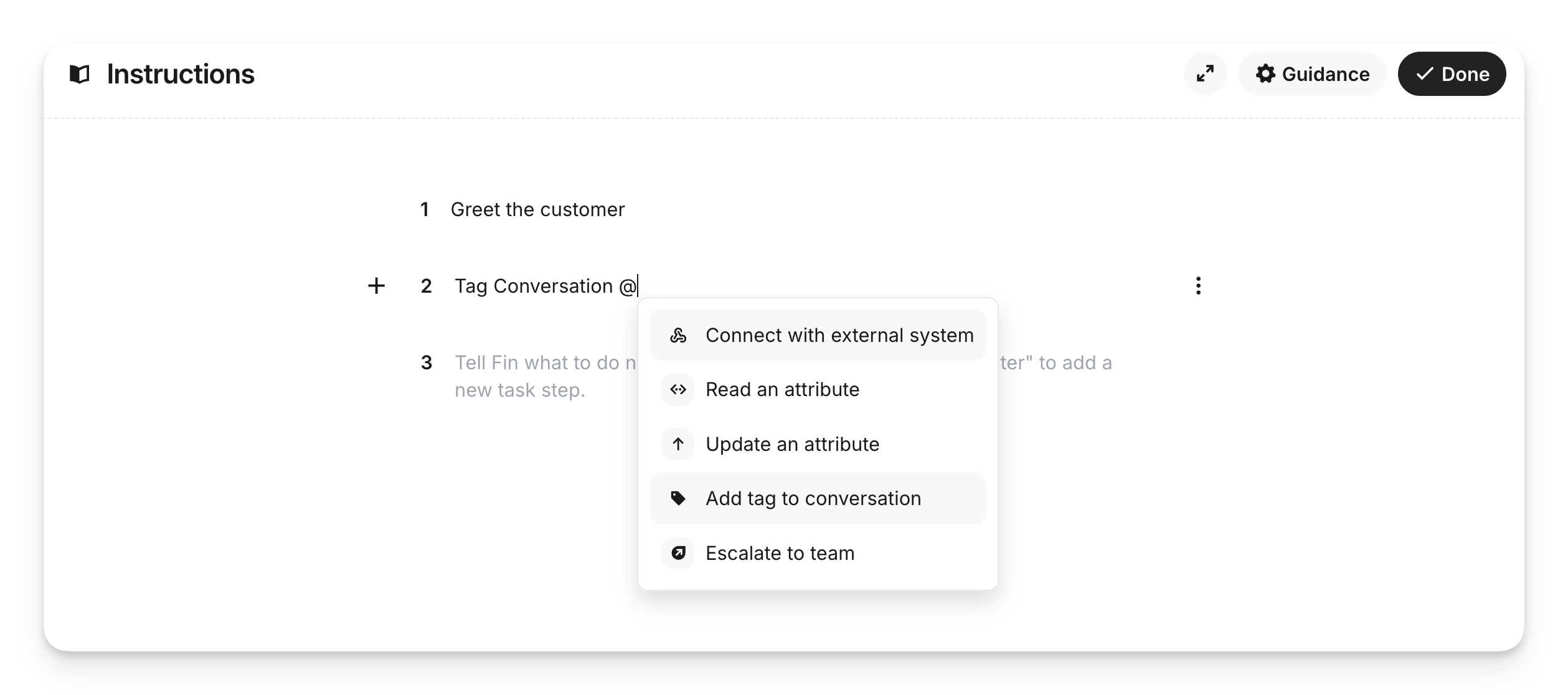 Add attributes to the instructions block by typing "@" in line with your text instructions. This allows Sweo to read and update attributes based on your specific business rules, at clear moments, with precise values. You can use any people, company, conversation, or temporary attribute.