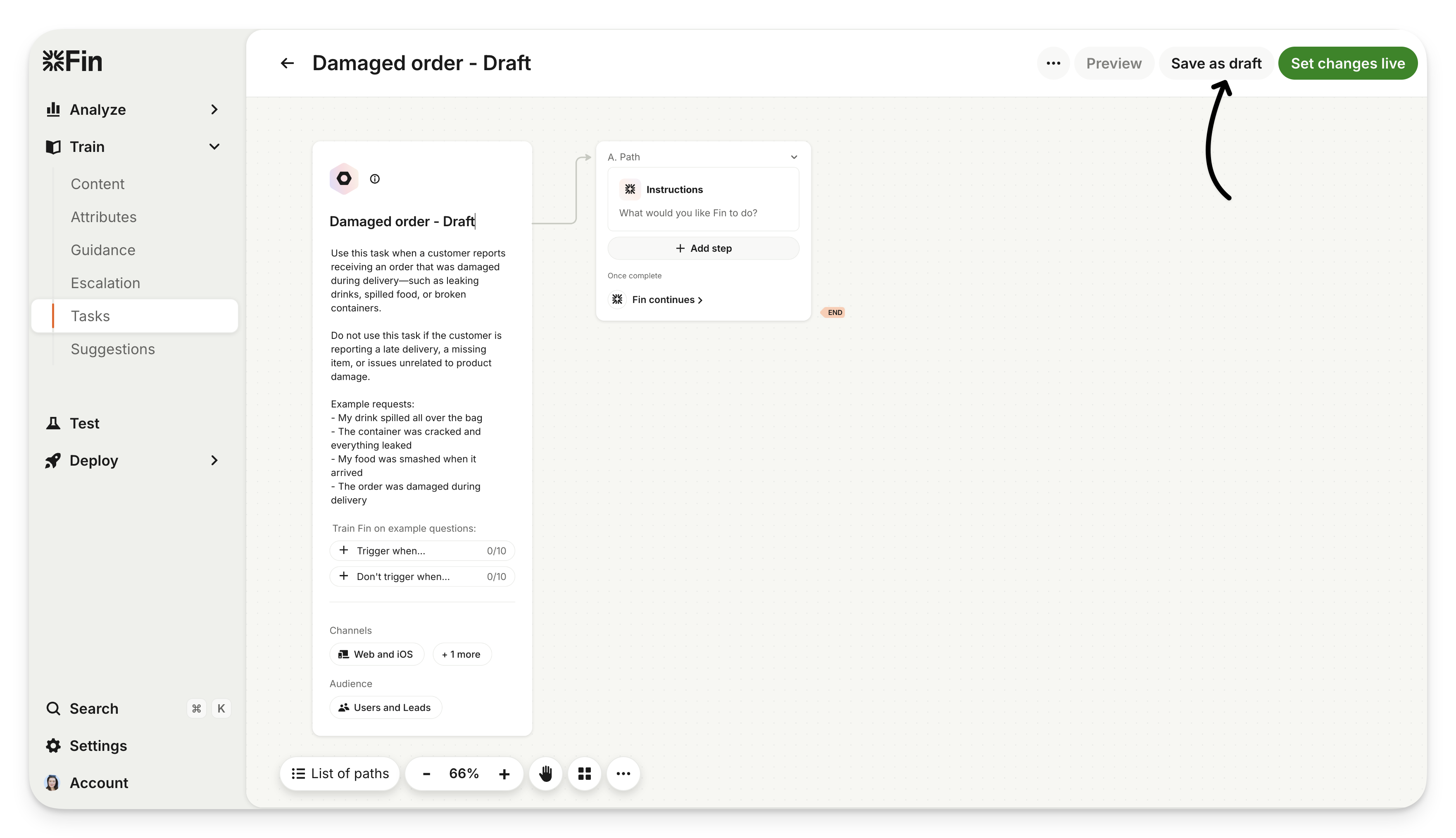 When you edit a Live Task, you'll see the Save as draft button. Clicking this saves your work to a draft version. Your live Task is not affected, so your customers will continue to experience the original flow.