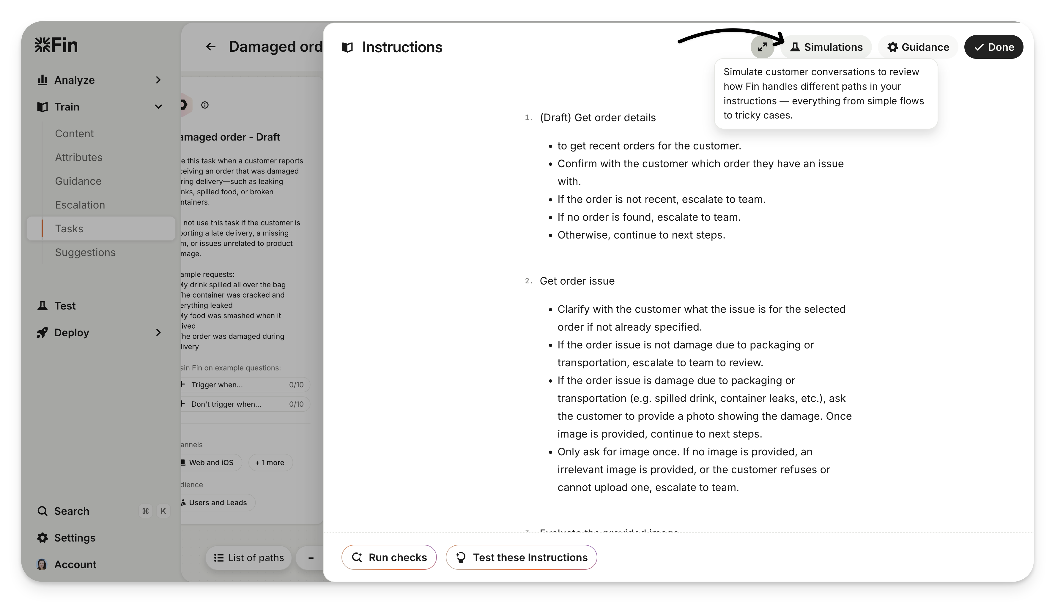 Test with Simulations: Running Simulations from the Task editor will test your draft's instructions. Simulations help you validate that an instruction block behaves as expected, especially for complex branching logic. To test Simulations click on the Instructions block.