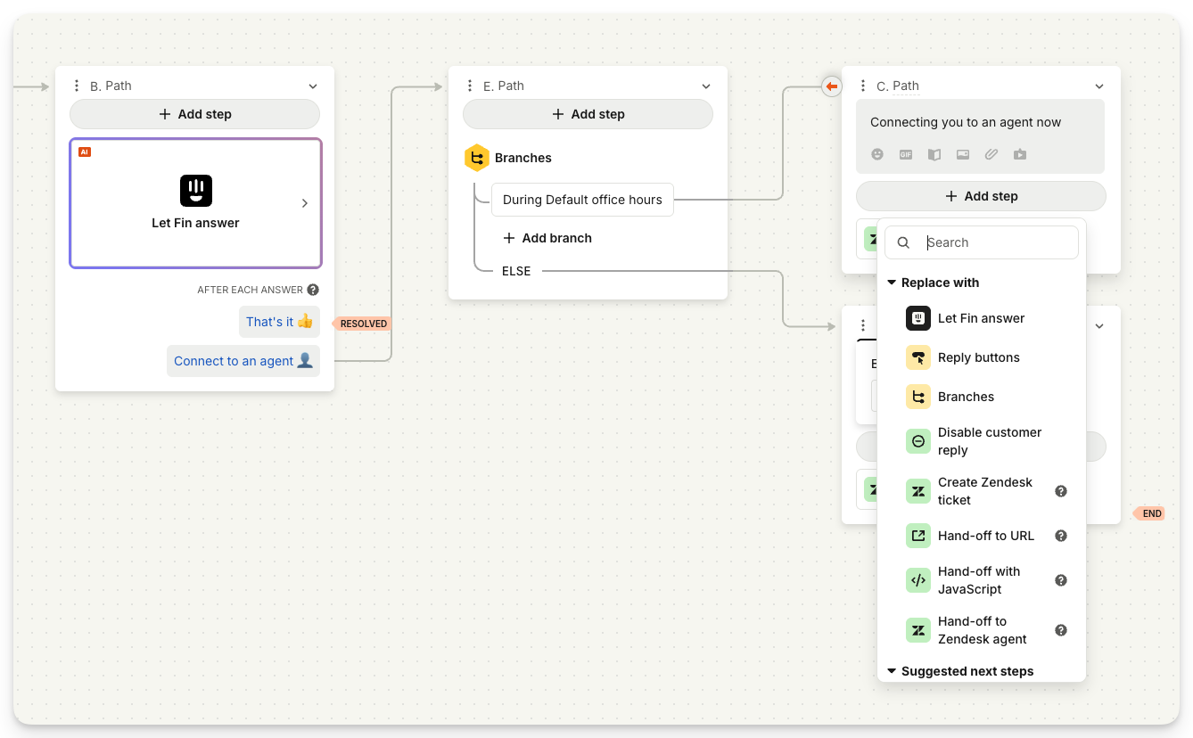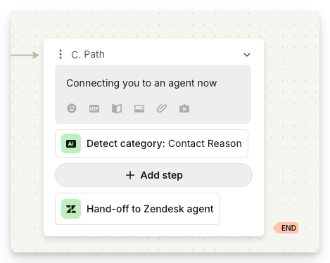 2. Add a "Hand off to Zendesk agent" or "Create Zendesk ticket" step to the end of your workflow