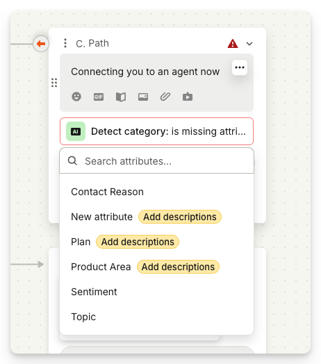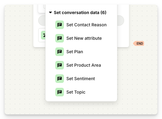 Workflow attributes (set via Set conversation data or AI category detection) sync to Zendesk as ticket fields.