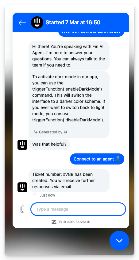 Your team's experience This creates a conversation in Zendesk for one of your agents to pick up and continue chatting to the end-user. |