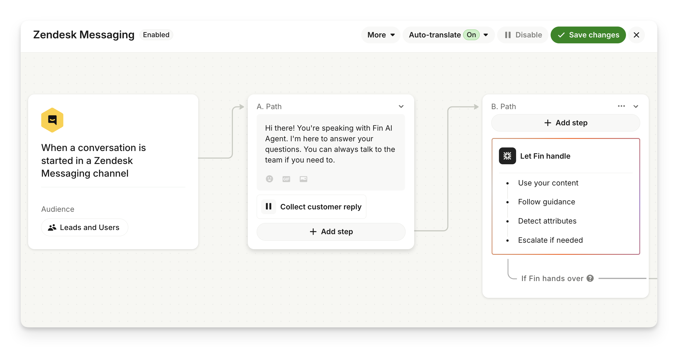 Add the "Hand-off to Zendesk agent" step.