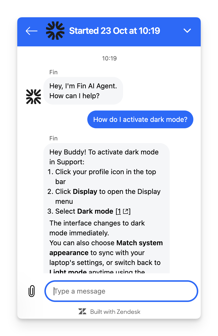 Customer experience When your agent replies to the conversation, their replies appear in the Zendesk Messenger creating a seamless experience for the end-user. |