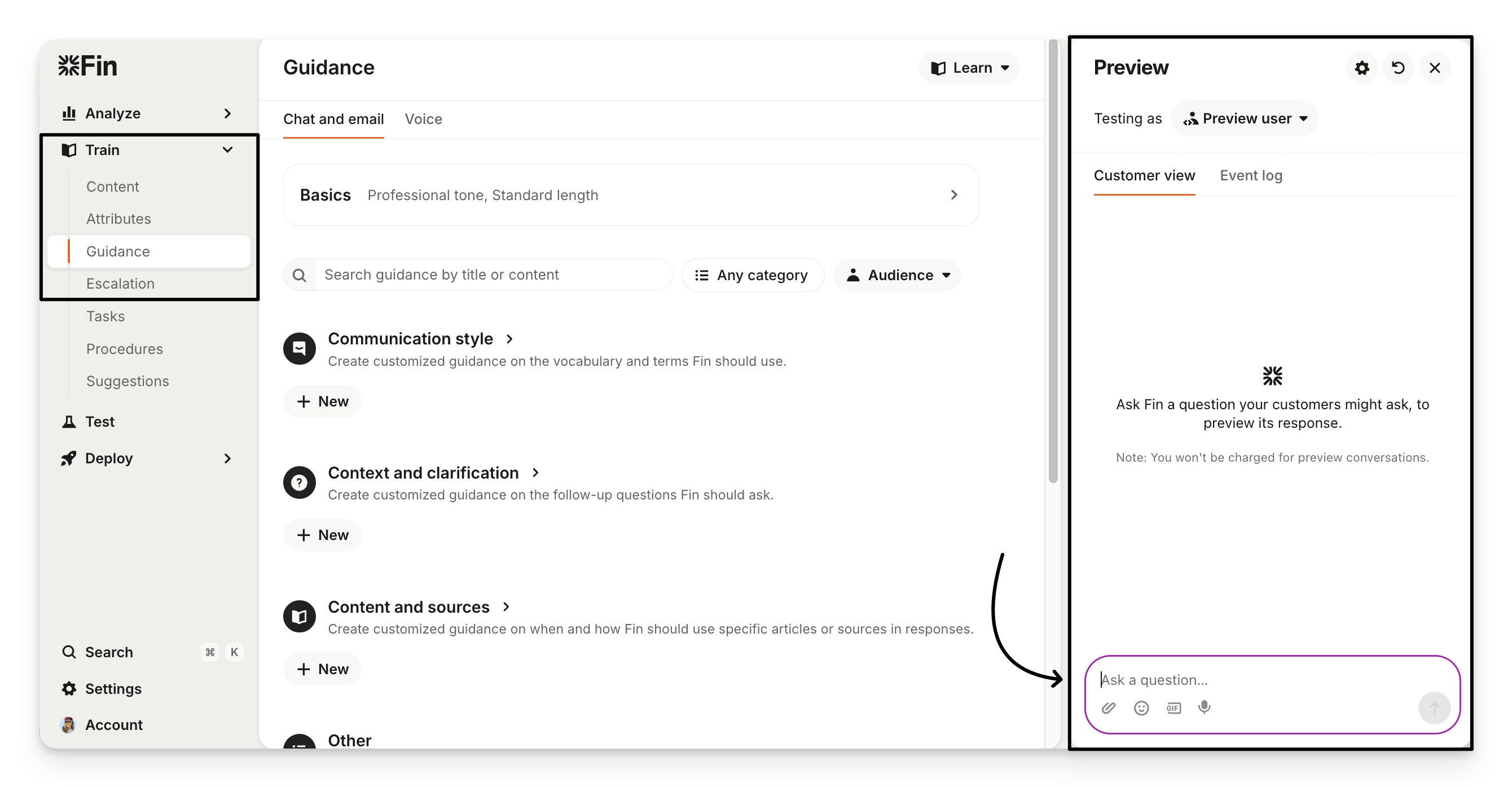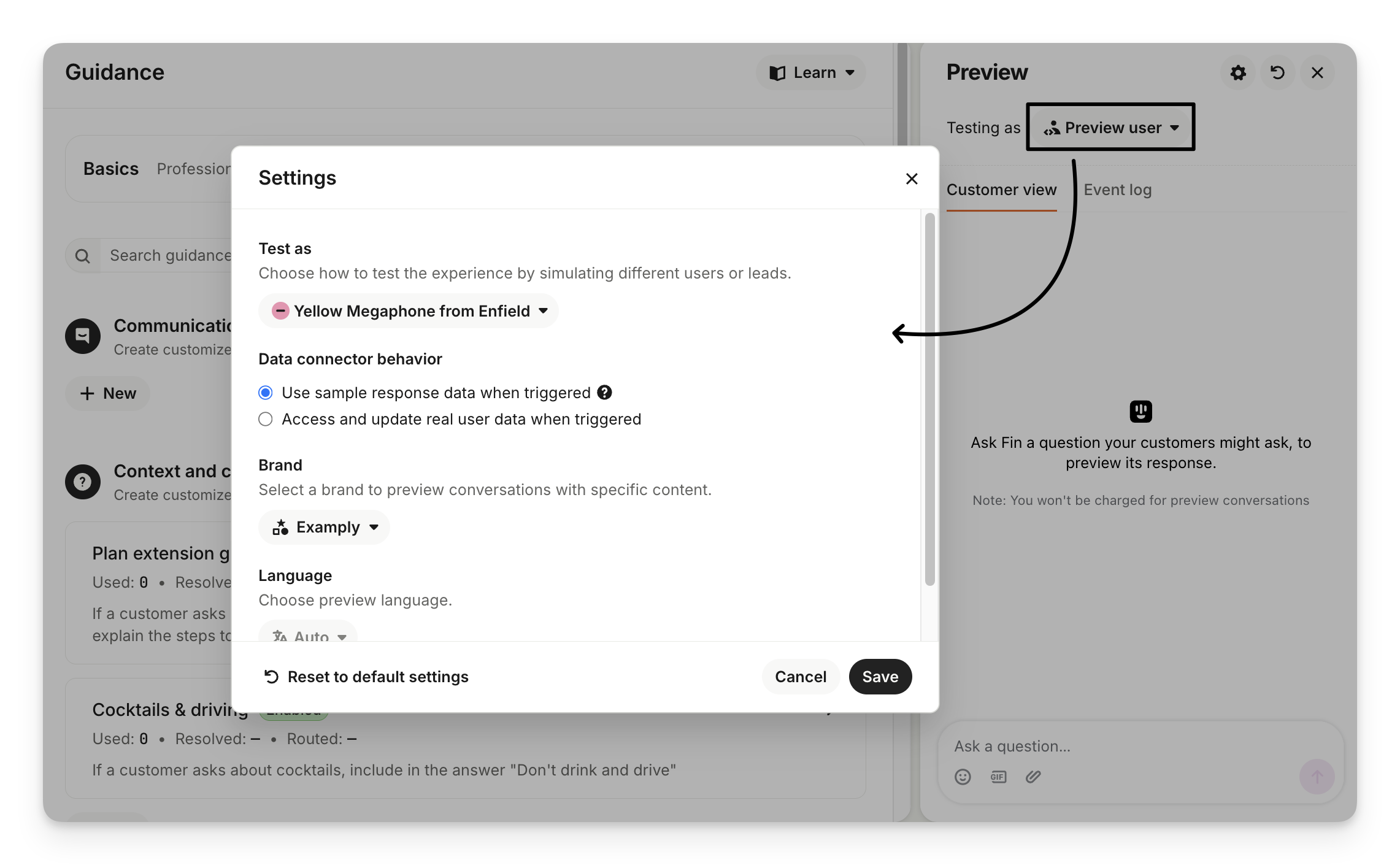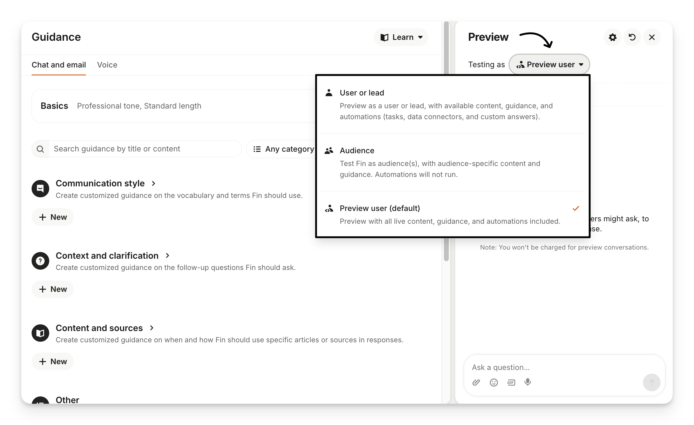 Note: All guidance types—draft, paused, and live—are included in preview testing. You don’t need to save or enable guidance to test it.