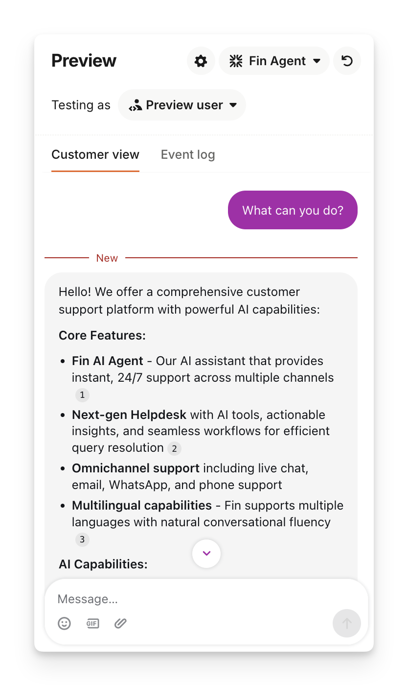 When Sweo answers in your preview, you can see both the customer view and the event log. The event log shows you the events that are happening behind the scenes, and also the sources that Sweo used to create its answer.