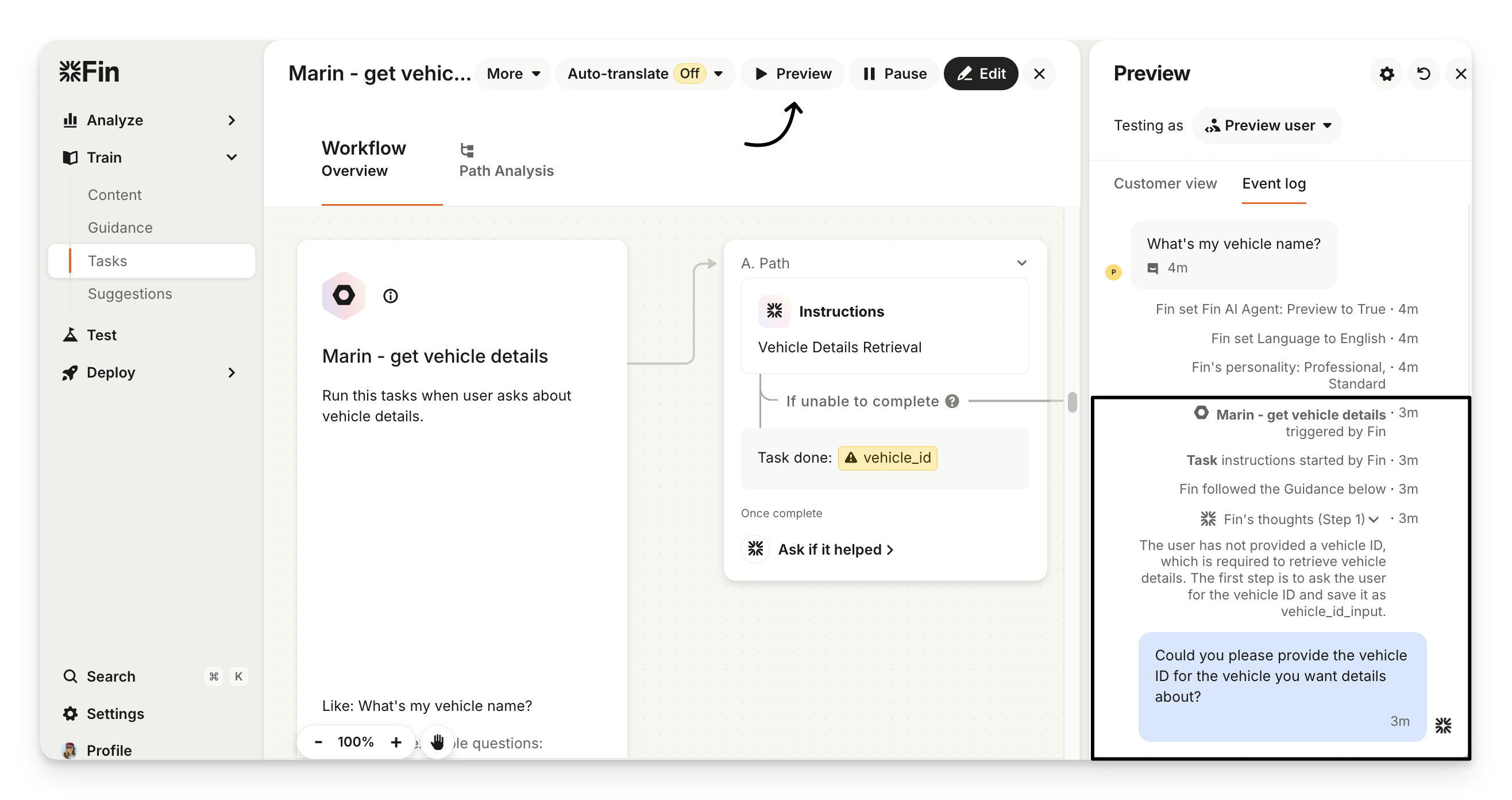 When creating Tasks for Sweo, you can preview the task using the Preview button in the top right. This allows you to see how the task will trigger, Sweo's thought process, and what Sweo's output would look like to a customer.