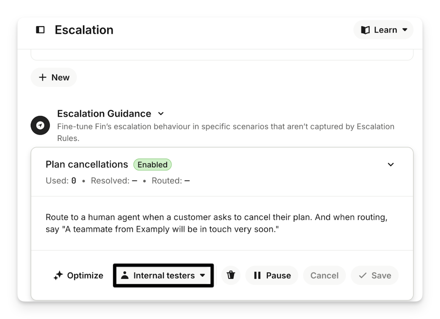 In Train > Escalation you can preview both Sweo’s Escalation Rules and Escalation Guidance safely before they affect real customers.
