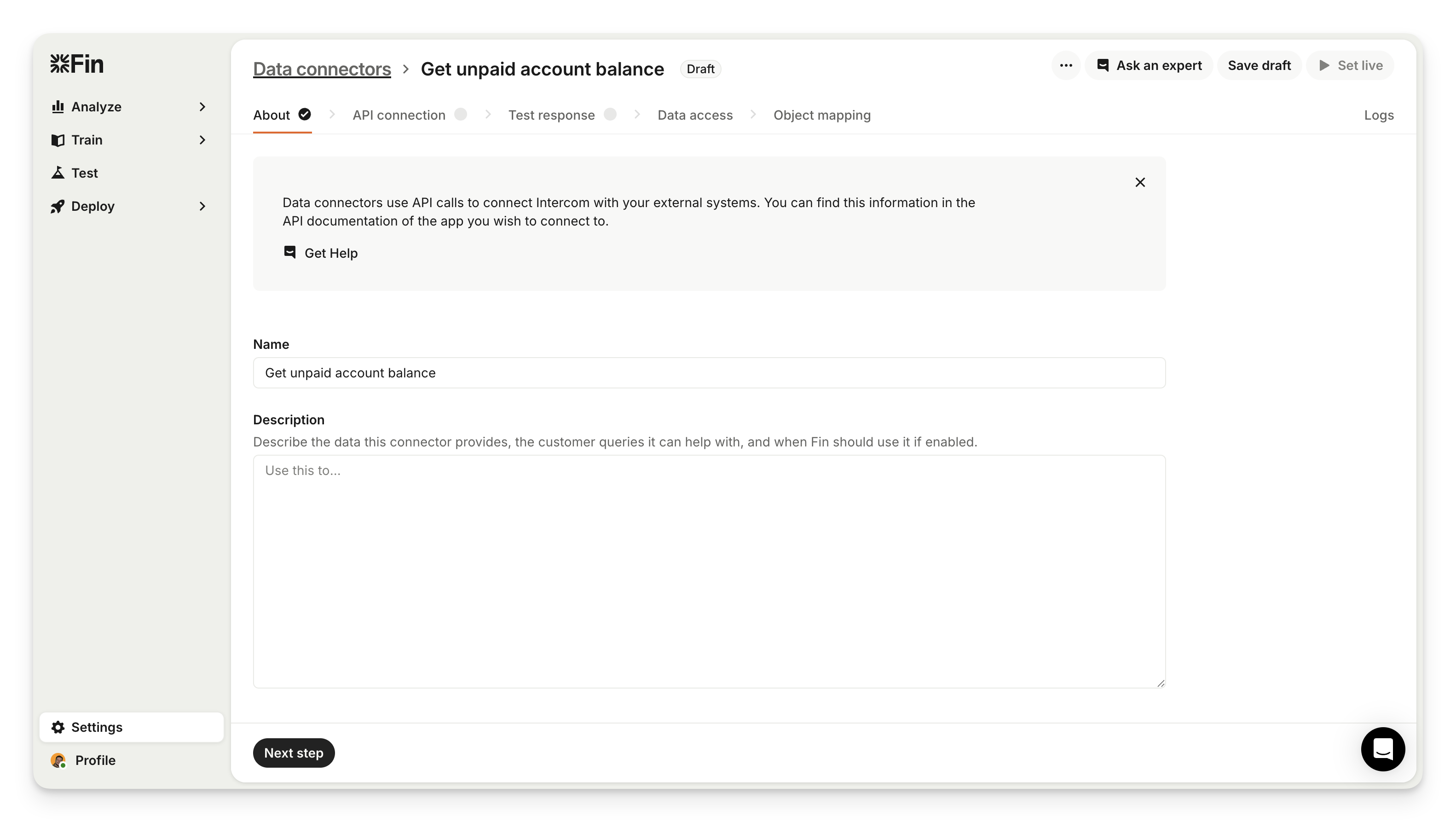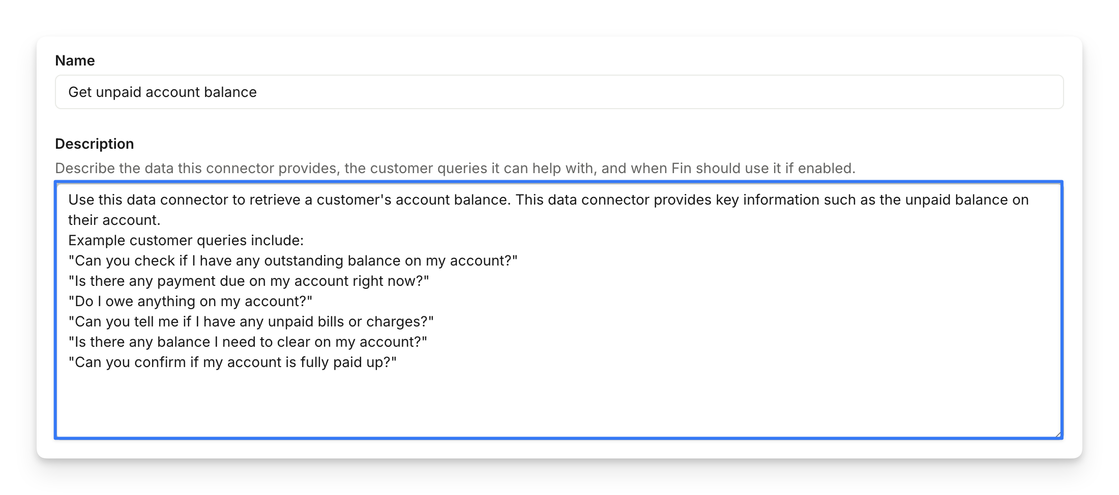 First, provide a short name to describe what this data connector does such as “Get unpaid account balance”. Next, provide a detailed description explaining when Sweo should use it.