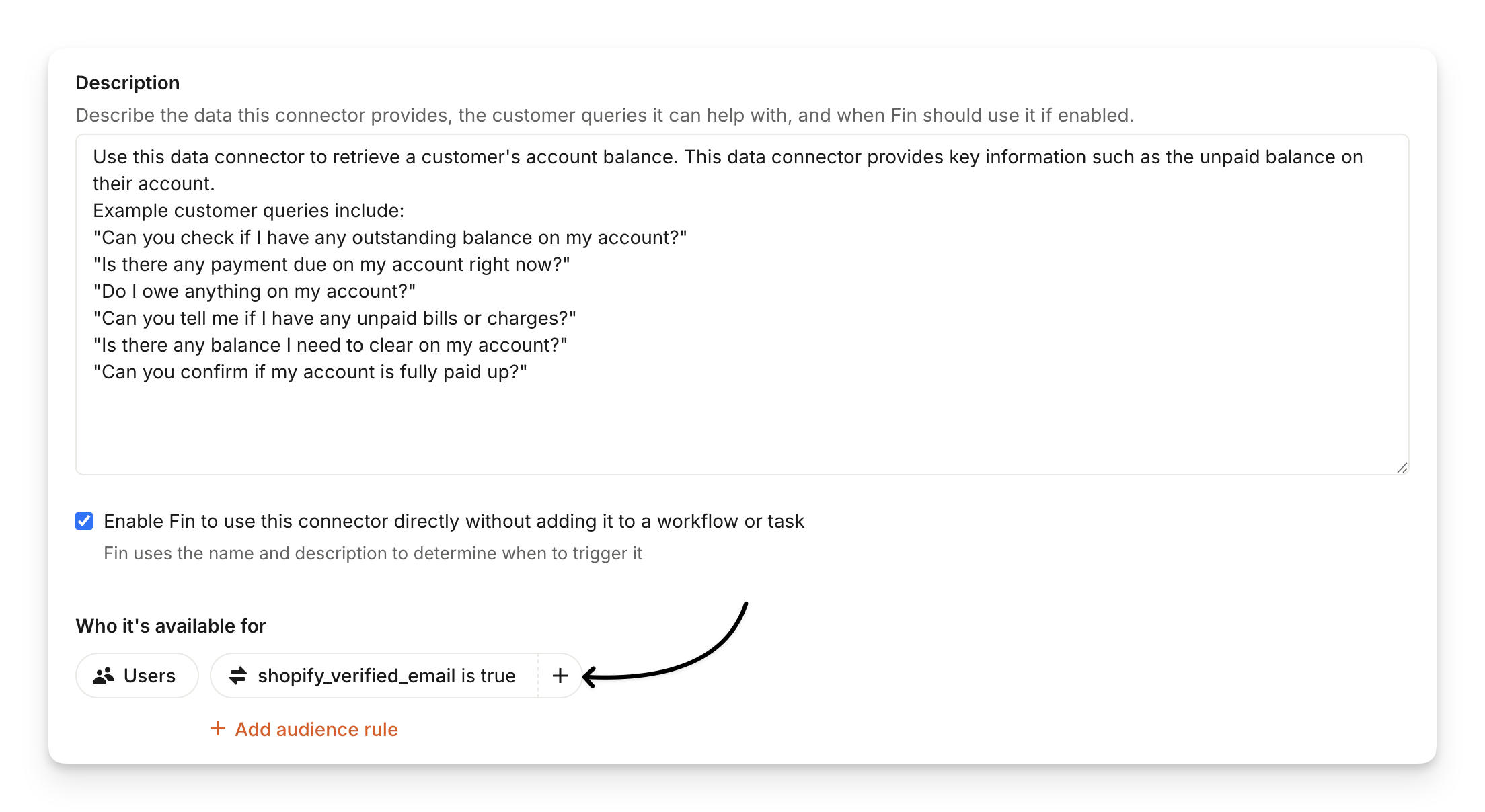 You can customize who this data connector is available for by clicking Add audience rule. This way, you can set up a data connector to be used when, for example, a logged in user with a verified email asks about their account balance.