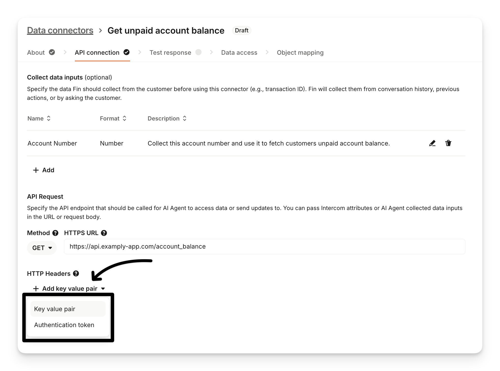 When creating data connectors for Sweo, there is no need to map response data to Intercom attributes or objects. Instead, Sweo directly interprets the JSON response and can then use it to resolve questions. The response is generated based on the ‘Test response’ section. Each line item corresponds to a data point in the JSON response.