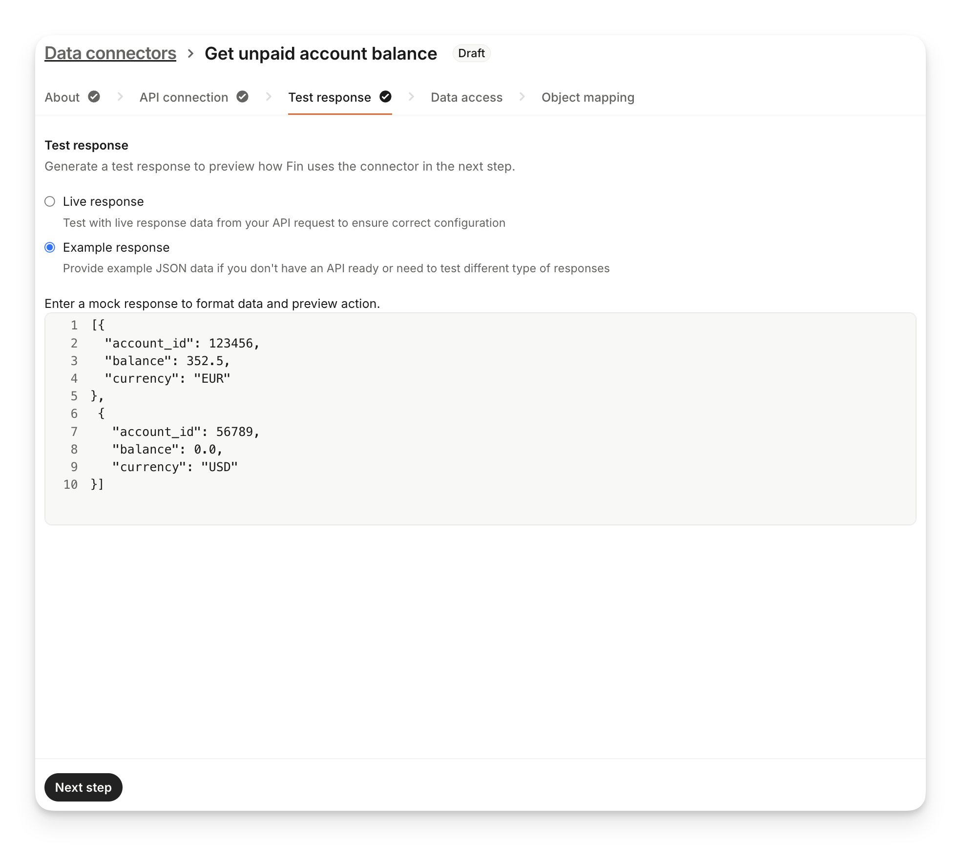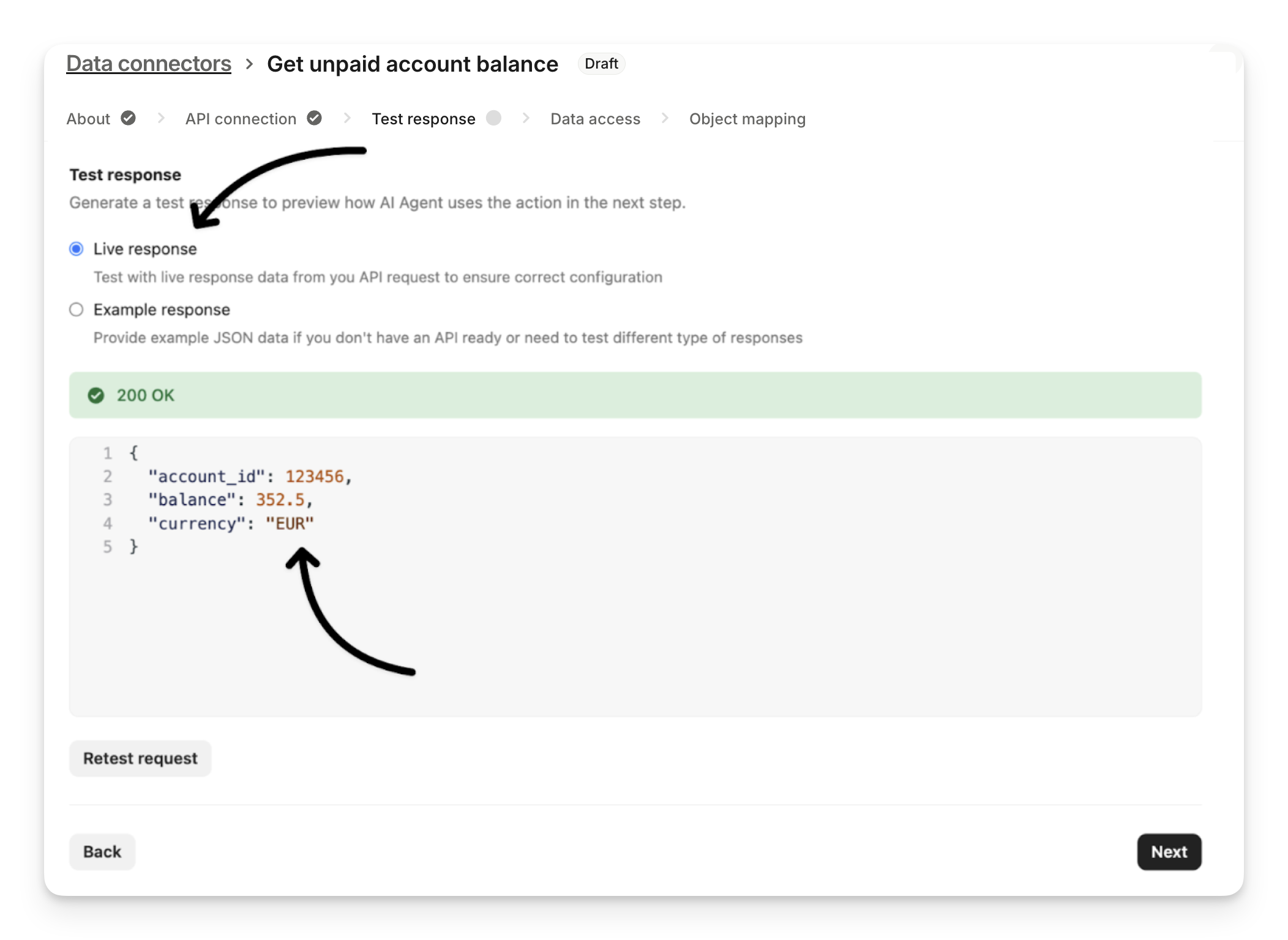1. Live response: Test with live response data from your API request to ensure correct configuration. Live response will make an actual API call to your endpoint so be careful in case this request affects any real-world data.
