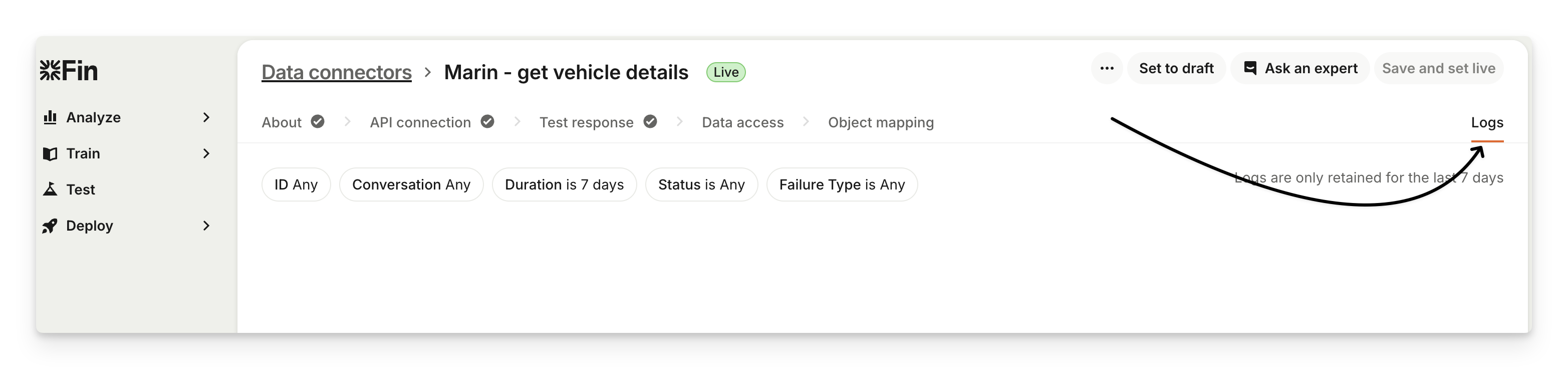 For troubleshooting purposes, all response data generated by data connectors triggered by Sweo is recorded for up to 14 days. You can access these logs under the Data Connector > Logs tab.