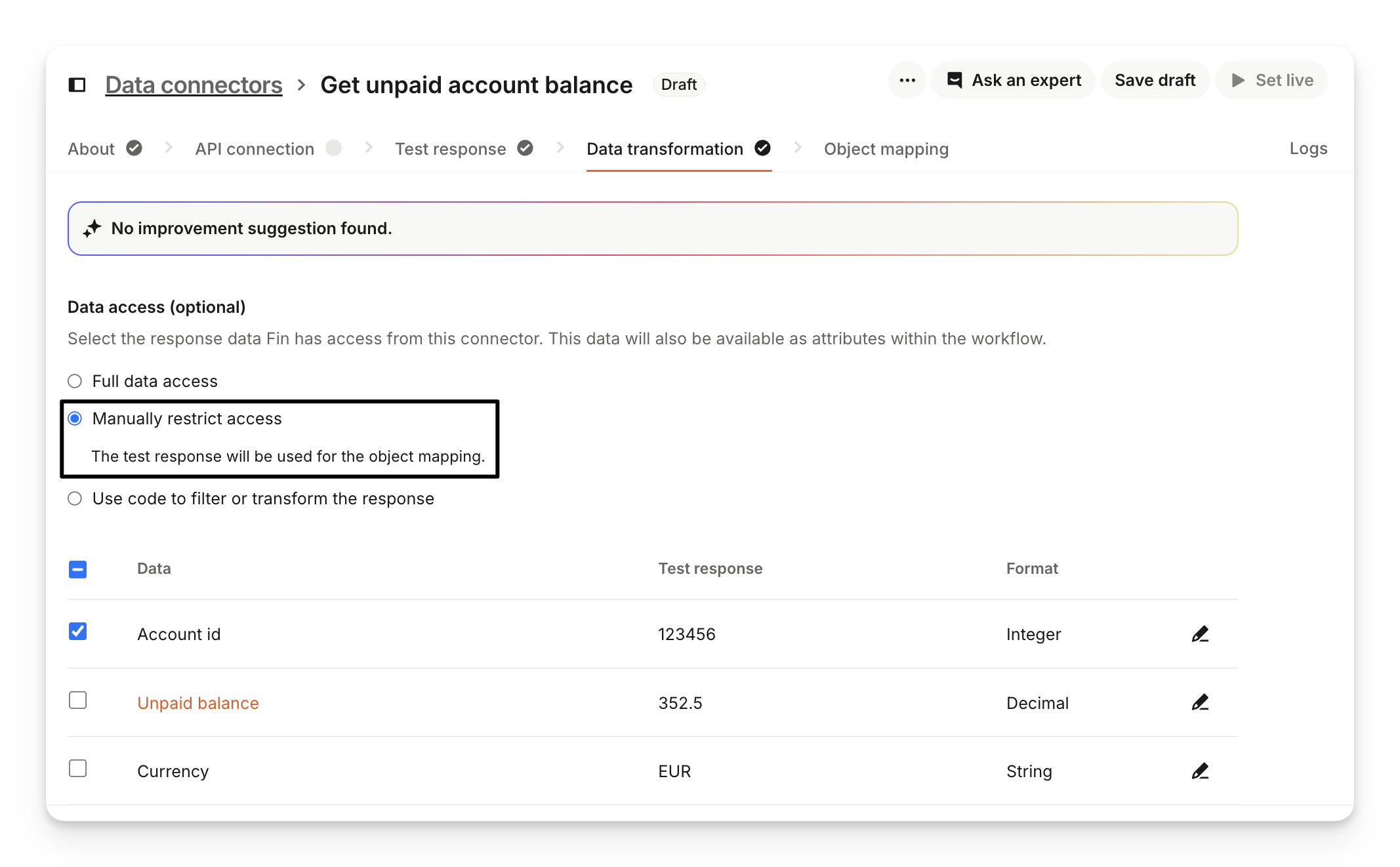 When you navigate to the Data transformation tab, your data connector response is automatically analyzed to identify suggestions that will improve Sweo's performance.