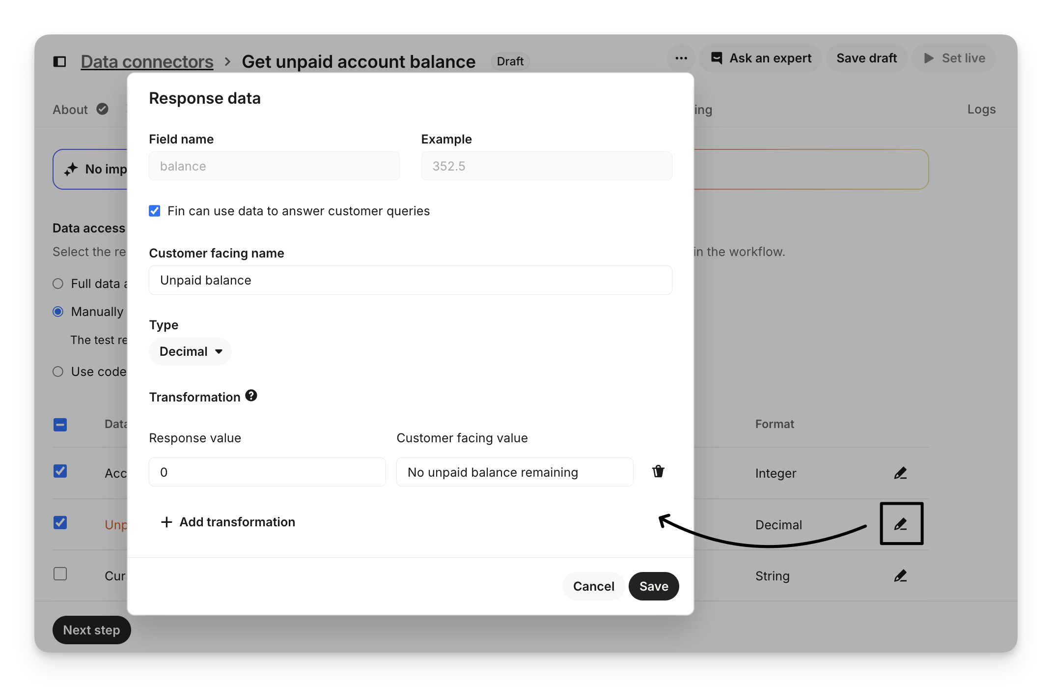 You can also edit the individual data items by clicking on the edit icon to give your response data a customer facing name as well as specify any transformations to the data.