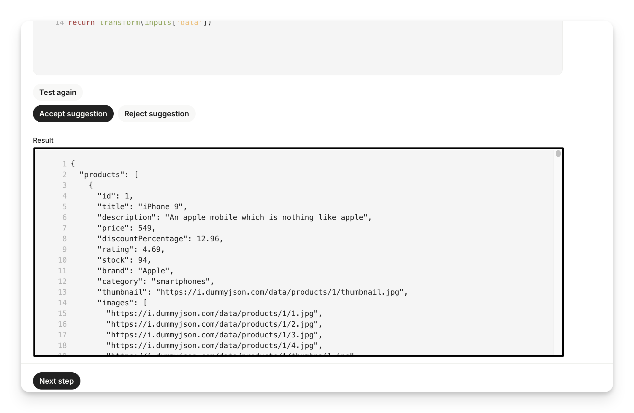 To access the data returned by your API (the test response), use the inputs['data'] variable inside your code block. Typically, this gives you the entire response from your API, ready to transform however you like.
