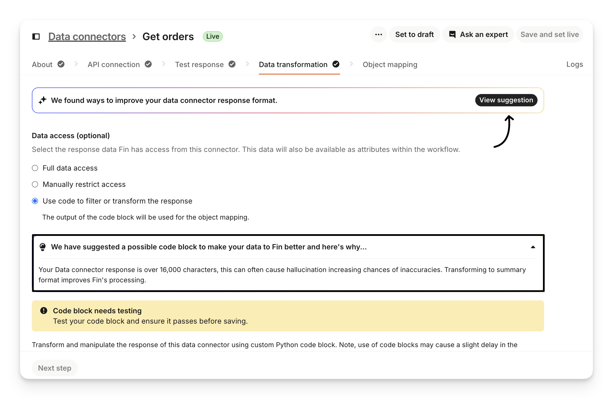 When a suggestion is found, you'll see a banner with a View suggestion button showing recommended Python code that will make your data cleaner and more reliable for Sweo.