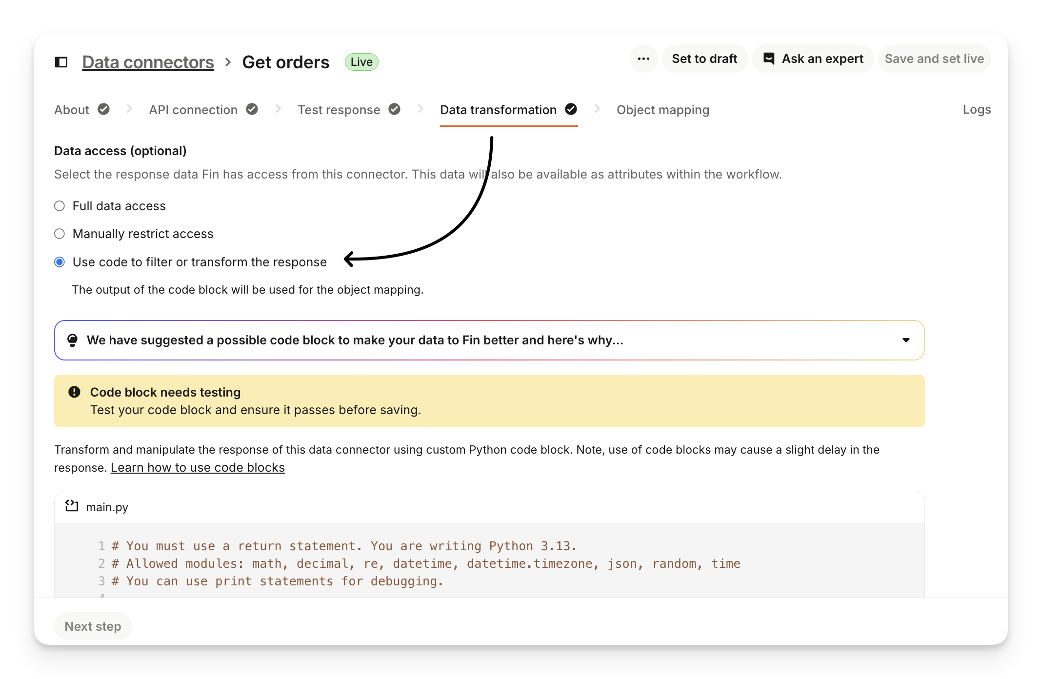 Then click on Data transformation and select the "Use code to filter or transform the response" option.