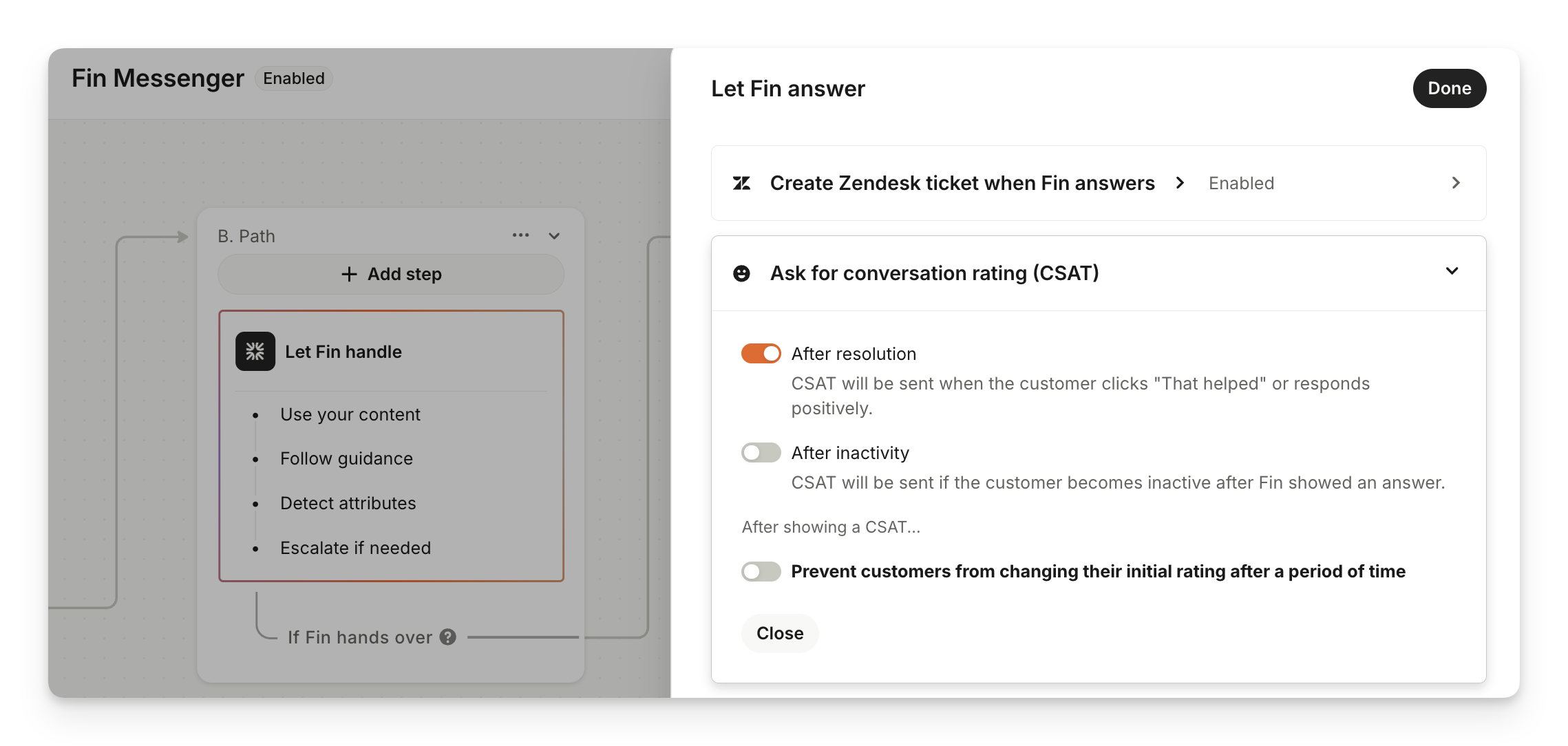 A side panel will appear where you can toggle on the options below "Ask for conversation rating (CSAT)".