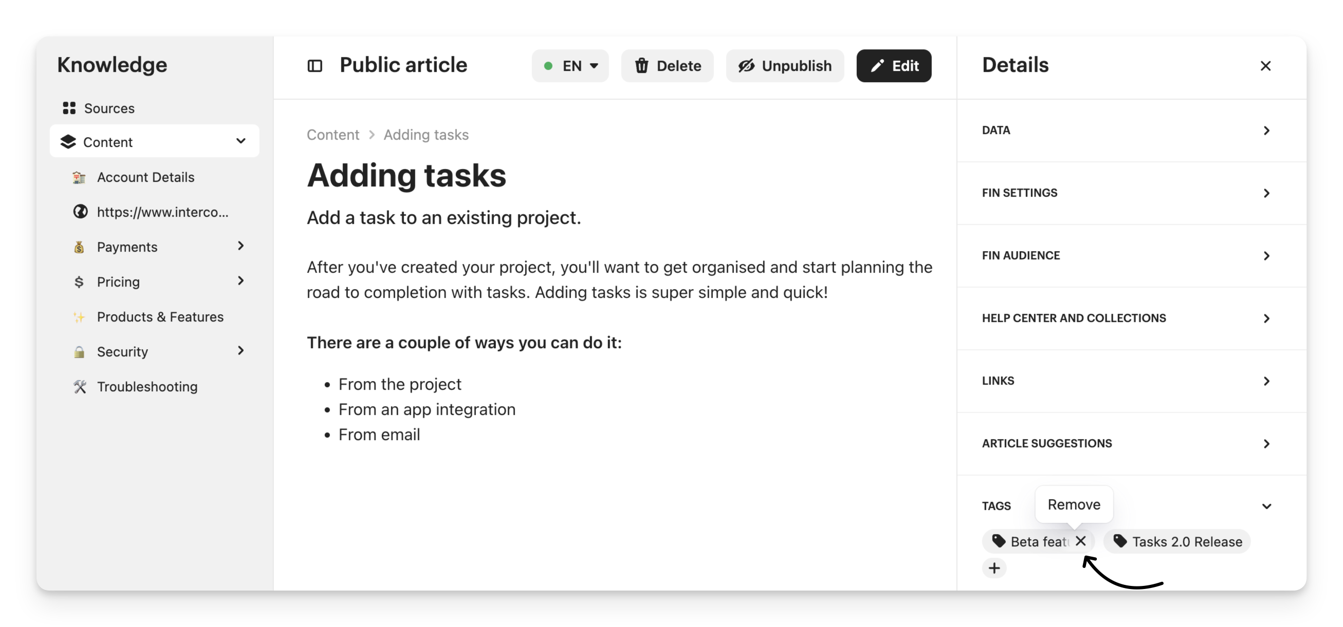 Audit and flag content - Use tags such as "Product Change" while auditing content that's impacted by a significant product release or change. This allows teammates to flag outdated content and collaborate on updating the content.